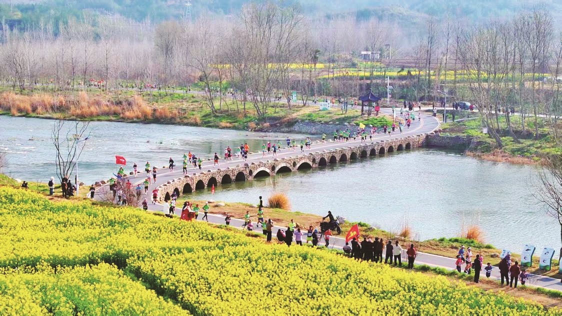 不同于城市赛道的喧嚣,远安马拉松的赛道沿“沮水绿道”缓缓展开,起终点均设于风景秀丽的桃花岛生态湿地公园,串联起桃花渡、双河堰、丹霞岩壁等诸多自然与人文地标。三月的远安,万亩油菜花肆意绽放,金黄的花海与清澈的沮水相依,两岸青山叠翠,村落炊烟袅袅,跑者穿行其间,仿佛闯入一幅流动的春日田园画卷。