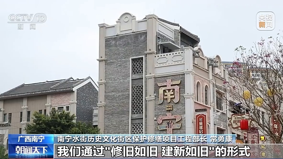 南宁水街历史文化街区保护修缮项目工程部长 常勇康:建设过程中我们通过“修旧如旧、建新如旧”的形式,对原有两处文保单位进行修缮加固,雕花窗棂、彩绘装饰等均依据历史照片与建筑残迹,由手艺传承人逐一进行手工修复、重绘,最大限度还原历史原貌。