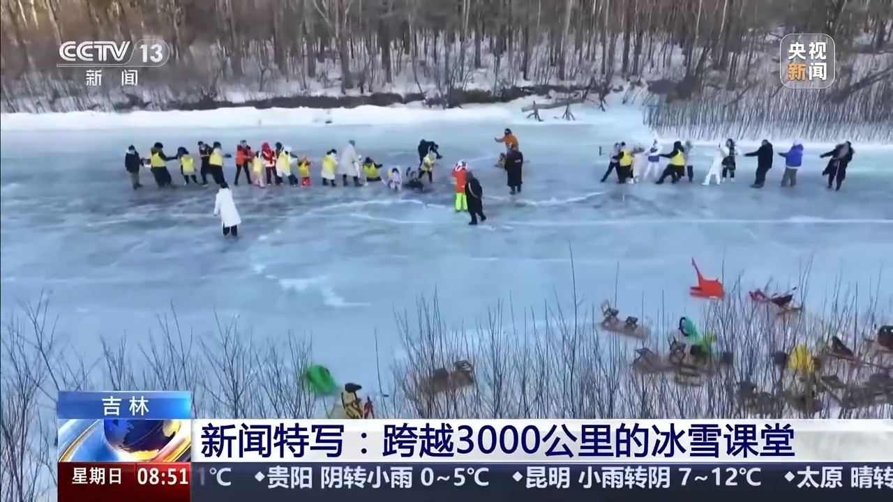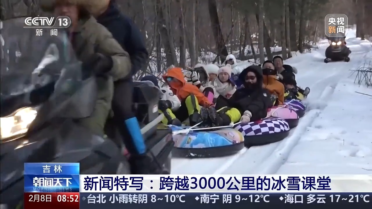 2月3日,吉林省安图县头山村的冰面上,一场特别的拔河比赛正激烈进行,对阵双方是来自粤港澳大湾区研学团的学生和他们的家长,由20多名6至15岁的学生和10位家长组成。伴随着“加油”声,这些来自南方的游客们在零下十几摄氏度的环境中体验着北方寒假的独特魅力。