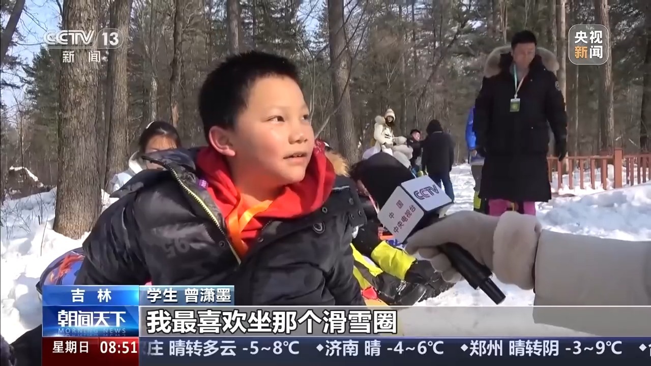 学生 曾潇墨:我最喜欢坐那个滑雪圈,从雪坡滑下来。