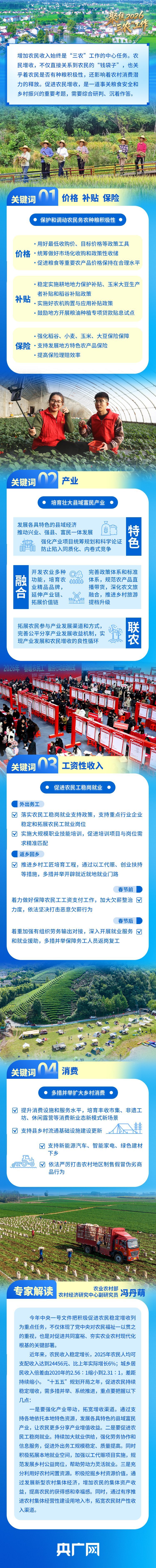 2月3日,《中共中央 国务院关于锚定农业农村现代化 扎实推进乡村全面振兴的意见》公布。这是党的十八大以来,中央连续出台的第14个指导“三农”工作的一号文件,也是“十五五”时期的首个中央一号文件。今年中央一号文件把促进农民增收摆在重要位置,提出了一揽子增收措施,打出一套政策“组合拳”。接下来,我们该如何把“稳定增收”落到实处?央广网约请相关专家进行解读。