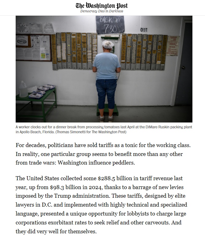 美国《华盛顿邮报》网站近日刊文称,数十年来,美国政客们一直将关税称作是工人的“良药”。但现实是,在贸易战中,获得最多好处的是另一个特定群体:华盛顿的政治掮客。而工人们却失去了很多工作机会。