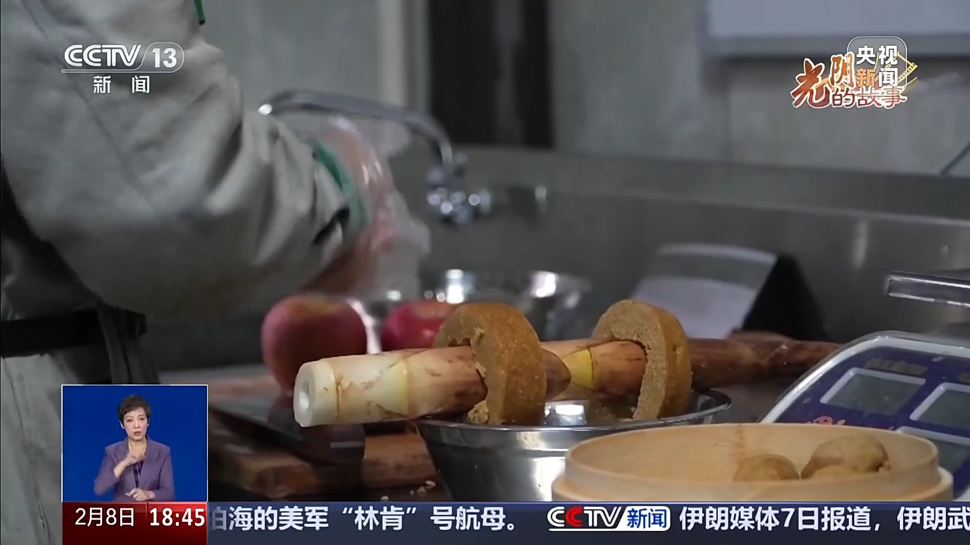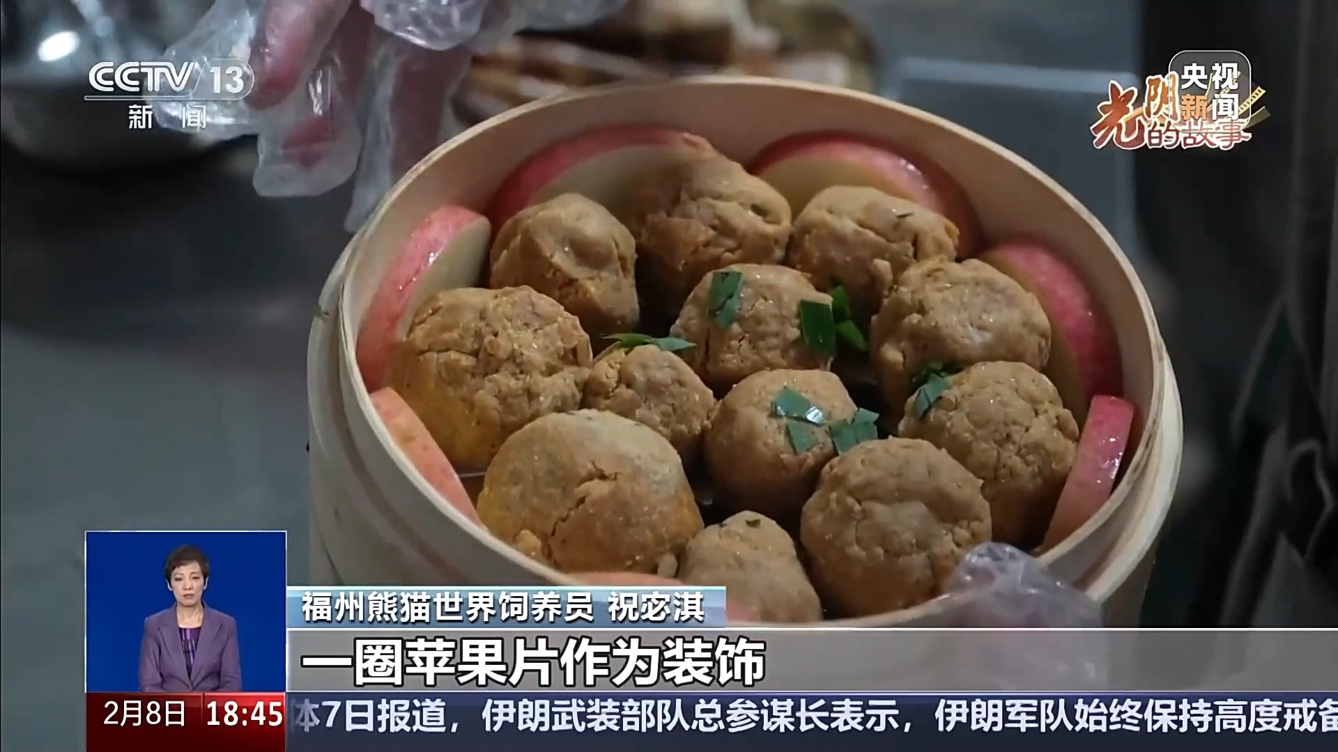 福州熊猫世界饲养员 祝宓淇:这是我们给“启航”用窝头捏成的一个鱼丸,我们里面旁边是放了一圈苹果片作为装饰,上面撒了一些竹叶碎,看起来比较像葱花。