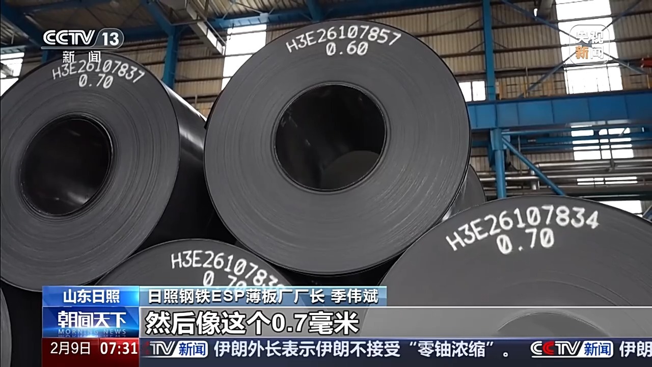 日照钢铁ESP薄板厂厂长 季伟斌:0.6毫米的产品,我们保持世界纪录已经8年了,到现在世界范围内没有第二家能够破这个纪录。0.7毫米,我们现在能够批量生产,但是像其他的厂,可能一年能生产一个卷。