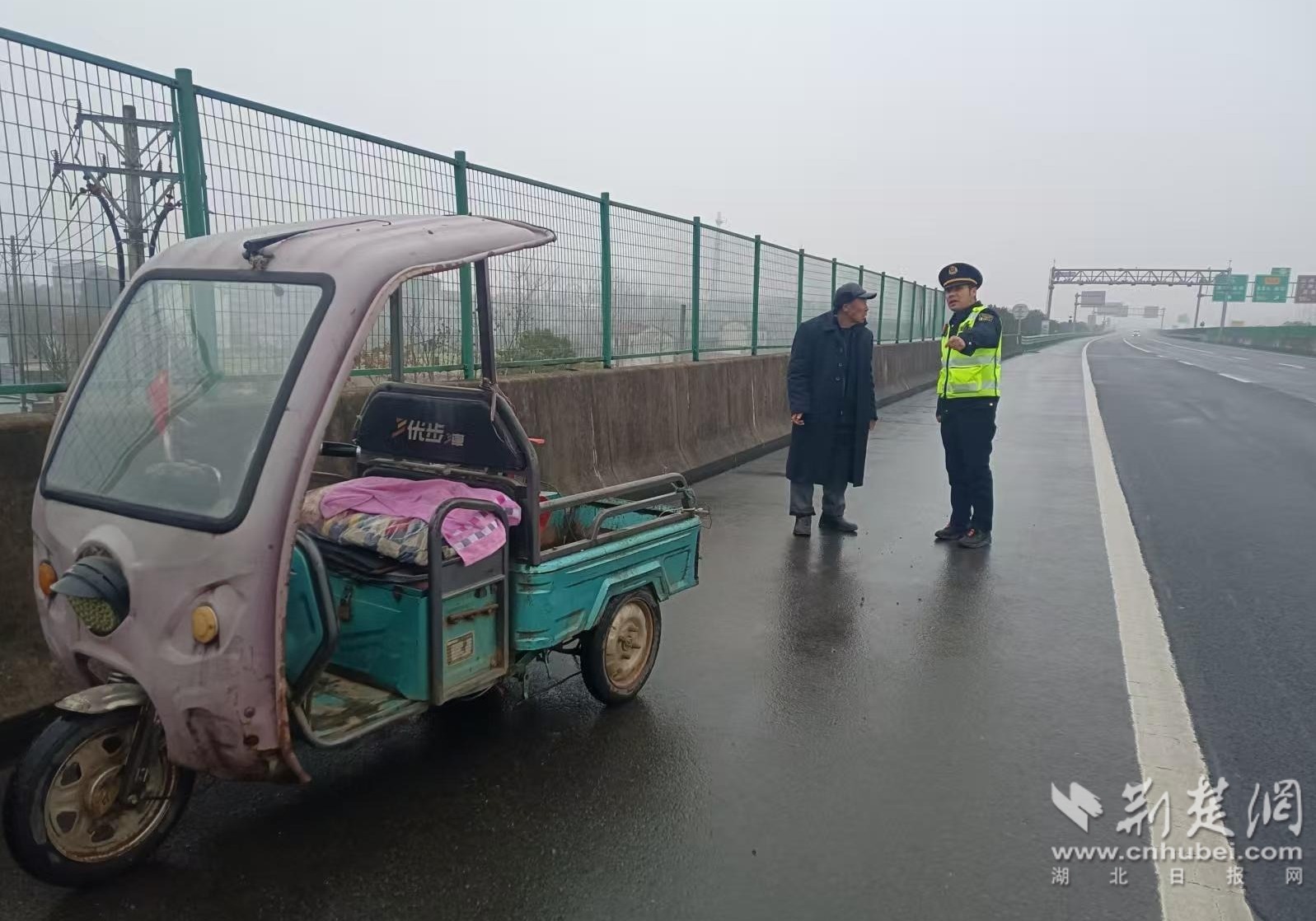 荆楚网(湖北日报网)讯(通讯员陈刚)2月6日,湖北省交通运输综合行政执法总队高速公路路政执法四支队五大队路政执法人员,在蕲嘉高速成功处置一起醉酒老汉驾三轮误闯高速险情,避免了一起恶性交通事故发生。
