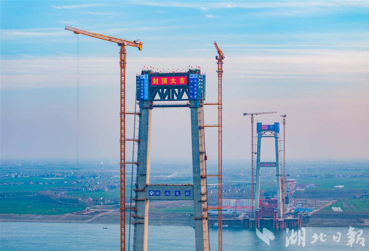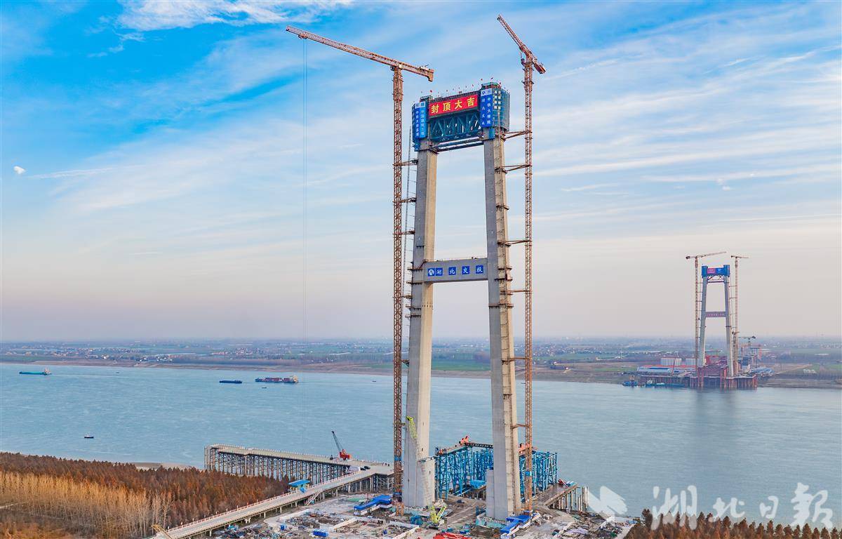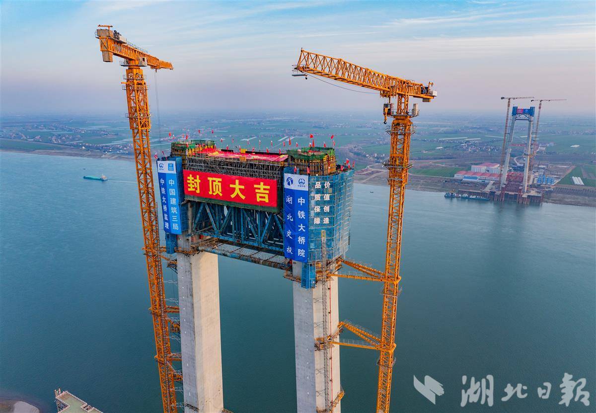 湖北日报讯 (记者戴辉、柯皓、通讯员张钰妍、乔朝辉)2月9日,由湖北交投集团投资,中国铁建大桥局、中建三局承建的荆州李埠长江公铁大桥成功封顶,其南北两座主塔分别高达220.5米、215.5米,标志着这项世界级工程正式转入上部结构施工新阶段,建设全面提速。