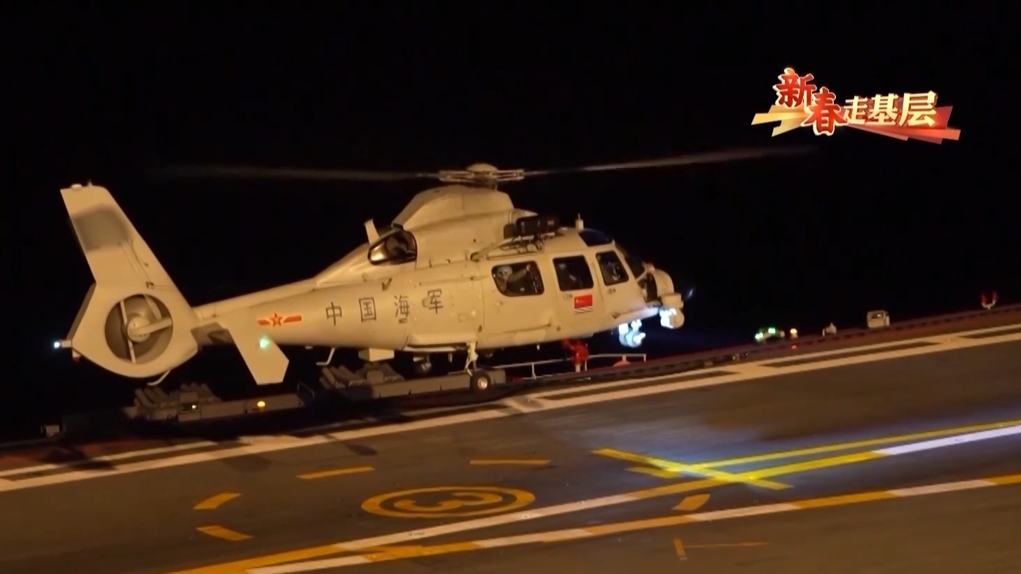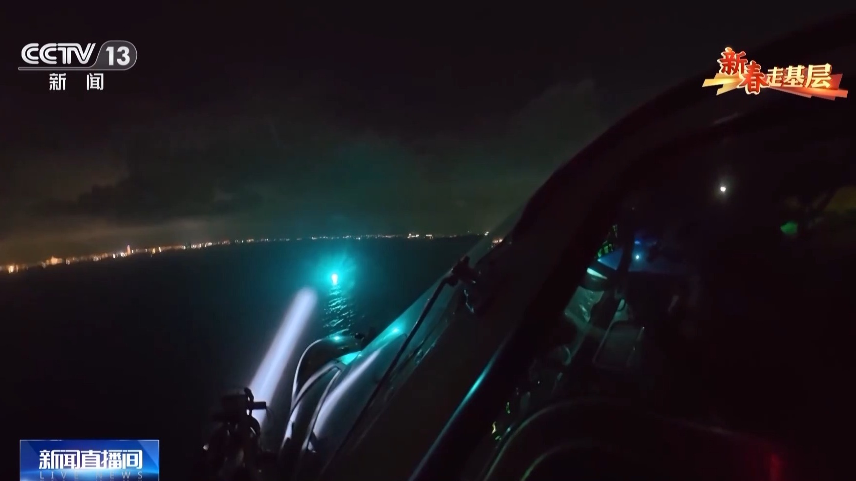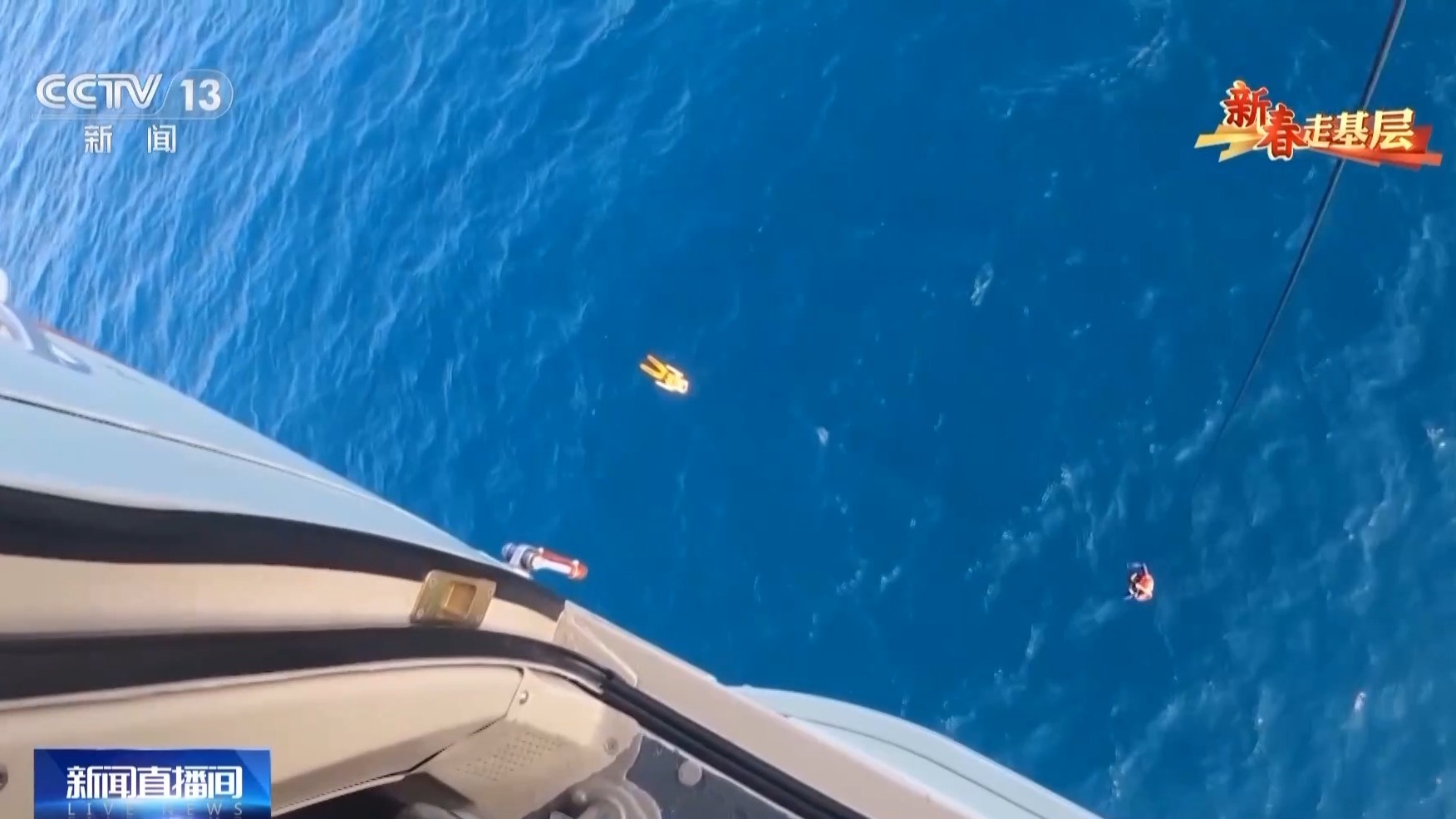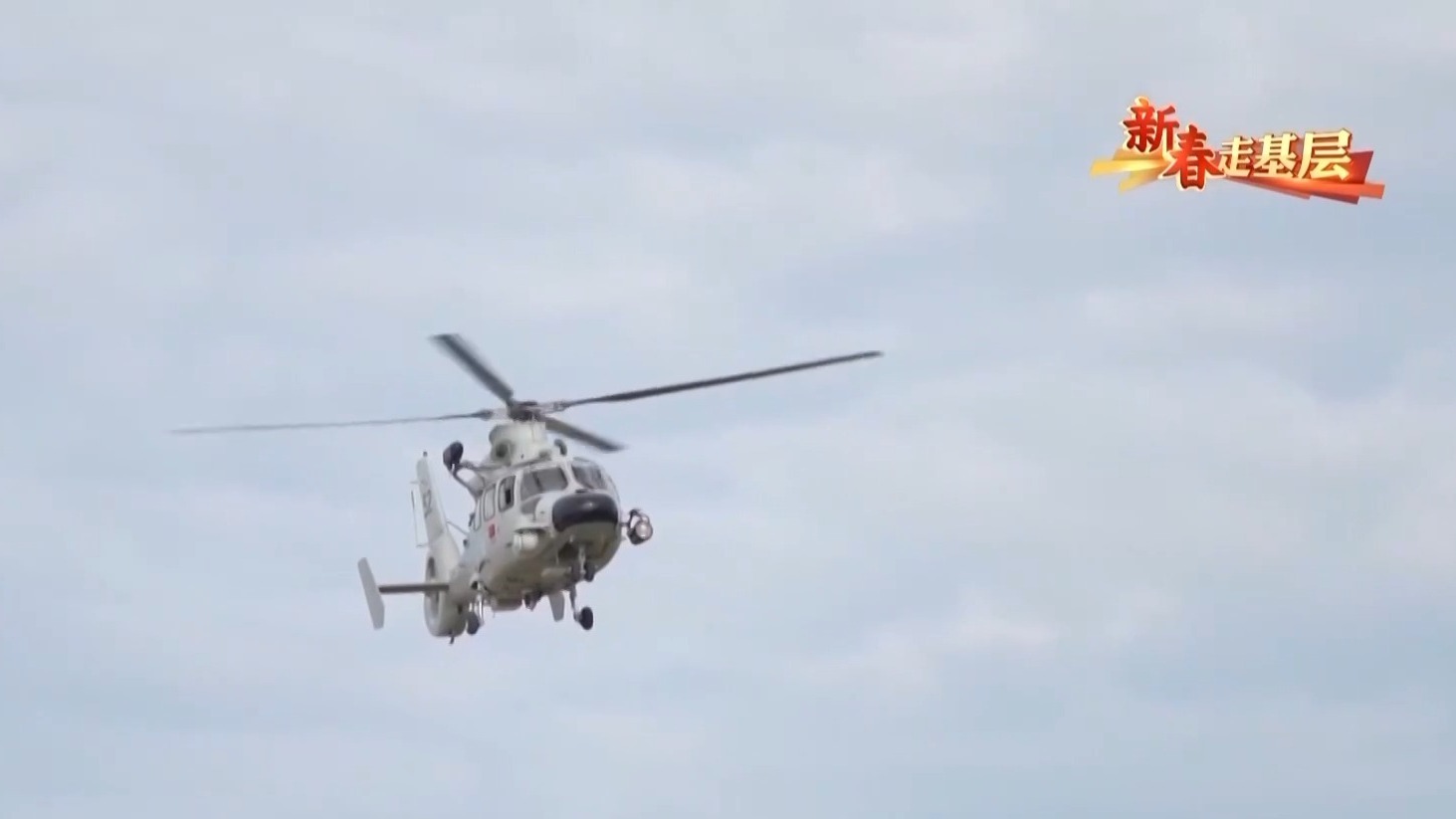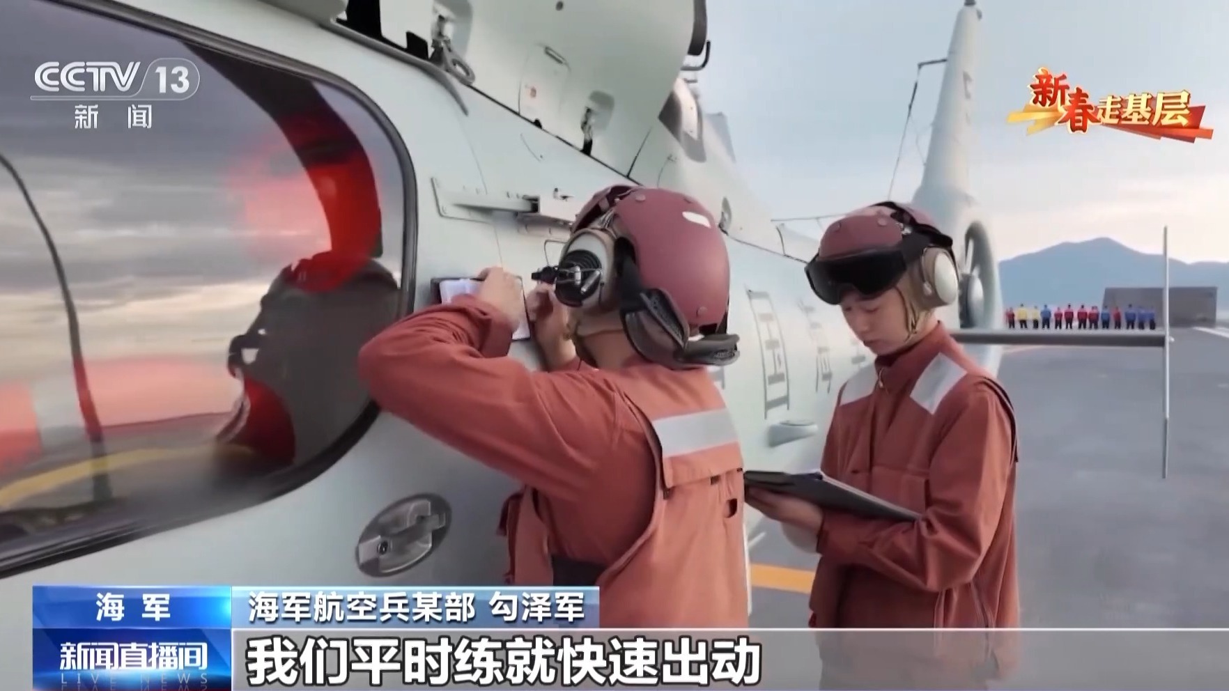 总台央视记者 王晓丹:这里是南部战区海军某舰载直升机部队的机场停机坪,我身后就是担负海上伴航搜救任务的直-9S舰载直升机,可以看到机头左侧配有多功能搜索灯,机头右侧配有观瞄装置,机身右侧还有电动绞车。现在,机务人员正在进行起飞前准备,我们也马上和机组人员一起登机,飞往南海某海域,展开跨昼夜舰机协同联合搜救演练。