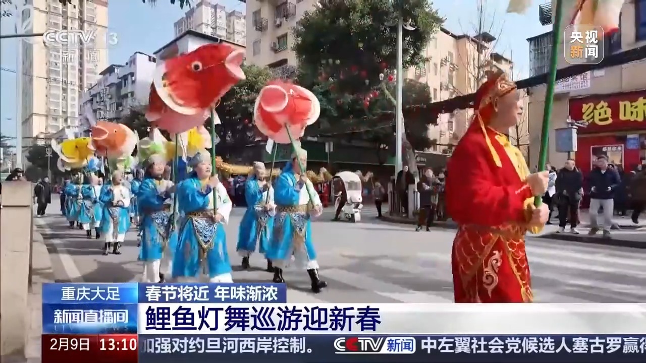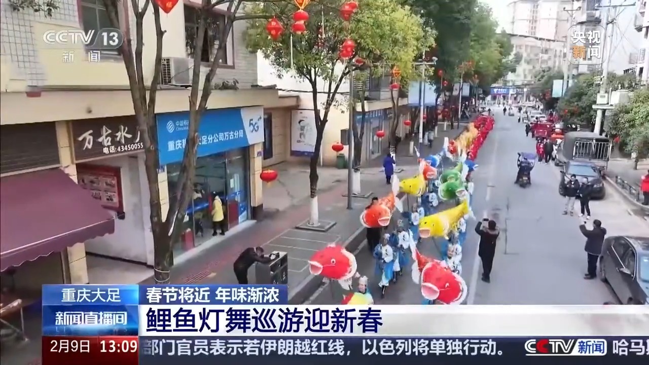 这两天,重庆市大足区的年节氛围热闹起来,鲤鱼灯舞开启迎新春巡游。巡游队伍穿行在集镇街巷,吸引了不少市民、游客观看、互动。
