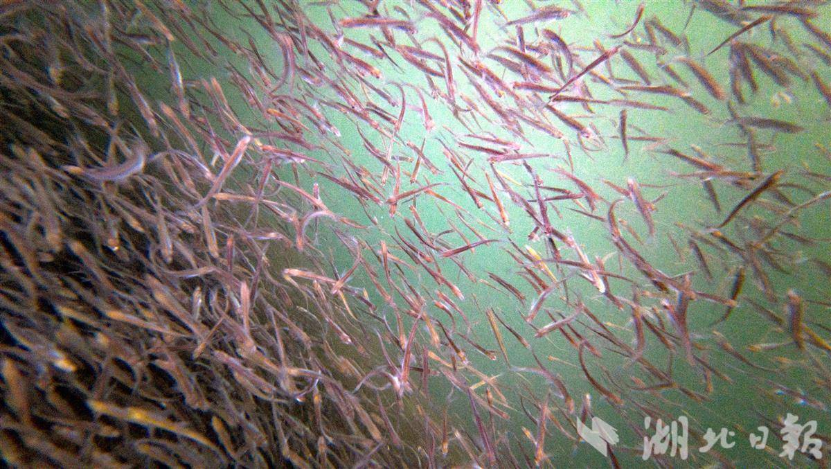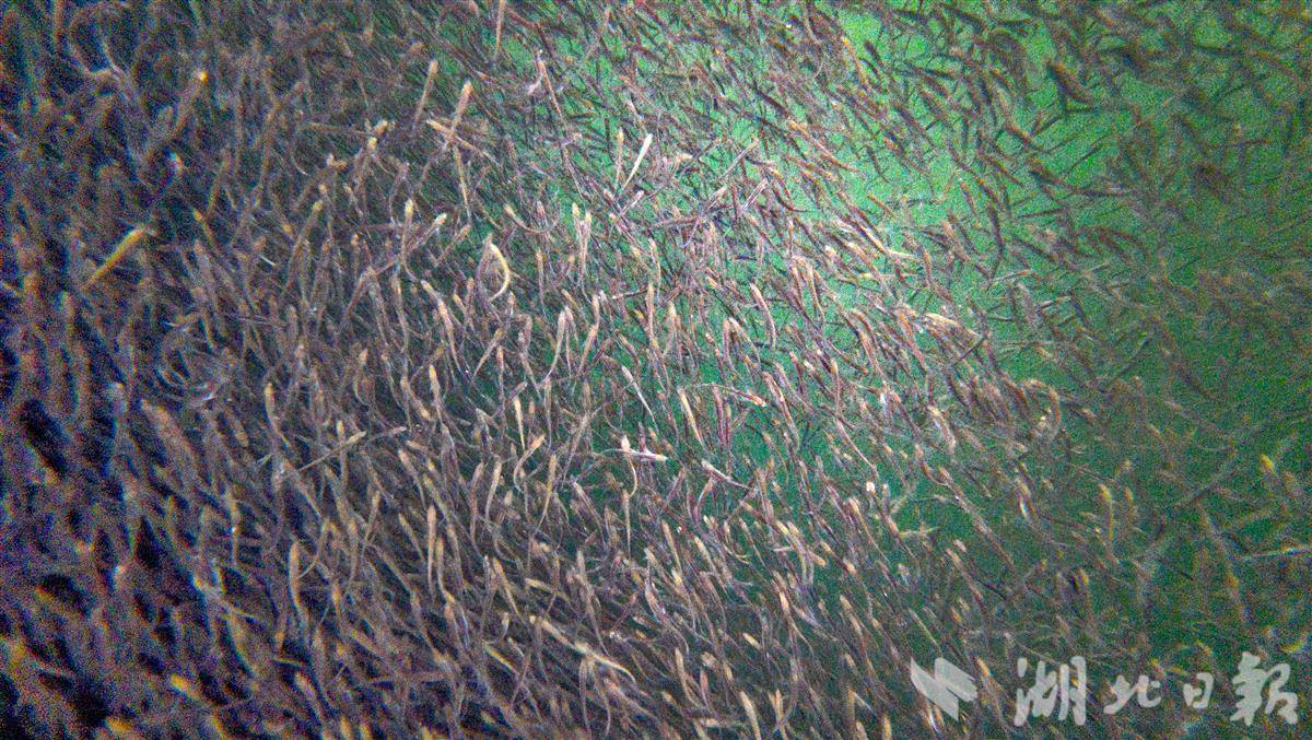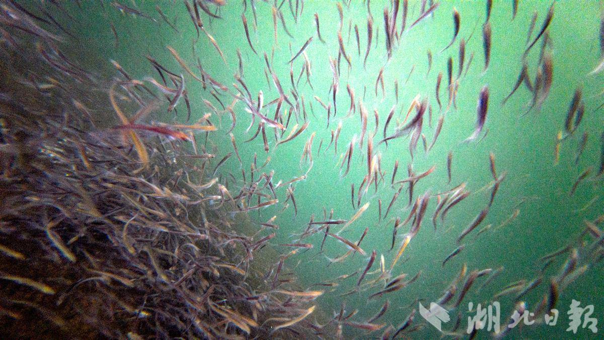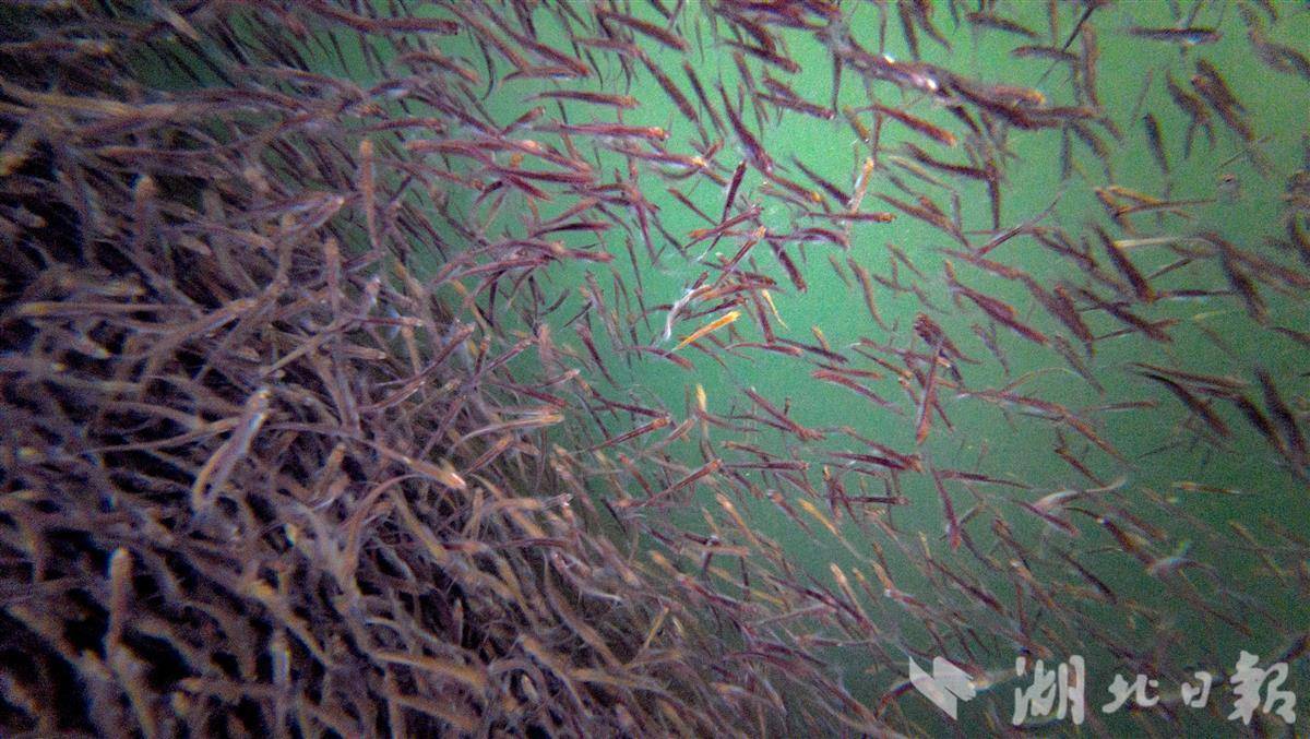 2月9日,秭归县游轮母港换乘中心码头水域,成群结队的鱼儿在澄澈碧波中肆意游弋、往来穿梭,时而聚成银鳞涌动的鱼群,时而四散舒展,构成一幅生机盎然的水下画卷。