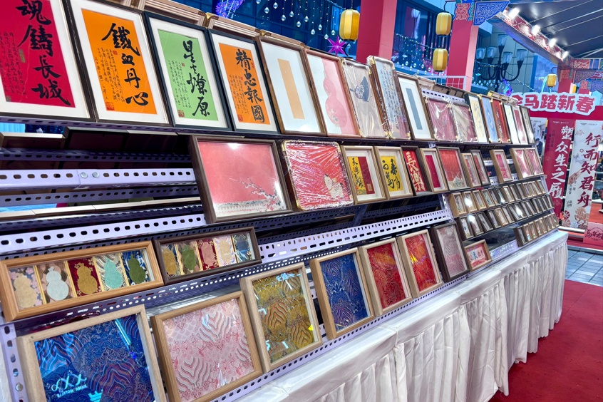 在解放碑重百新世纪年货市集上,漆画、扎染、书法画等各类非遗产品纷纷披上了“新年装”。采用扎染技艺制作的小马布袋、融入宋锦文化的刺绣“福”字、书写着“吉祥如意”“马上成功”等吉语的书法画……巧妙融入了马年意象与新春吉祥元素,吸引众多市民和游客驻足。