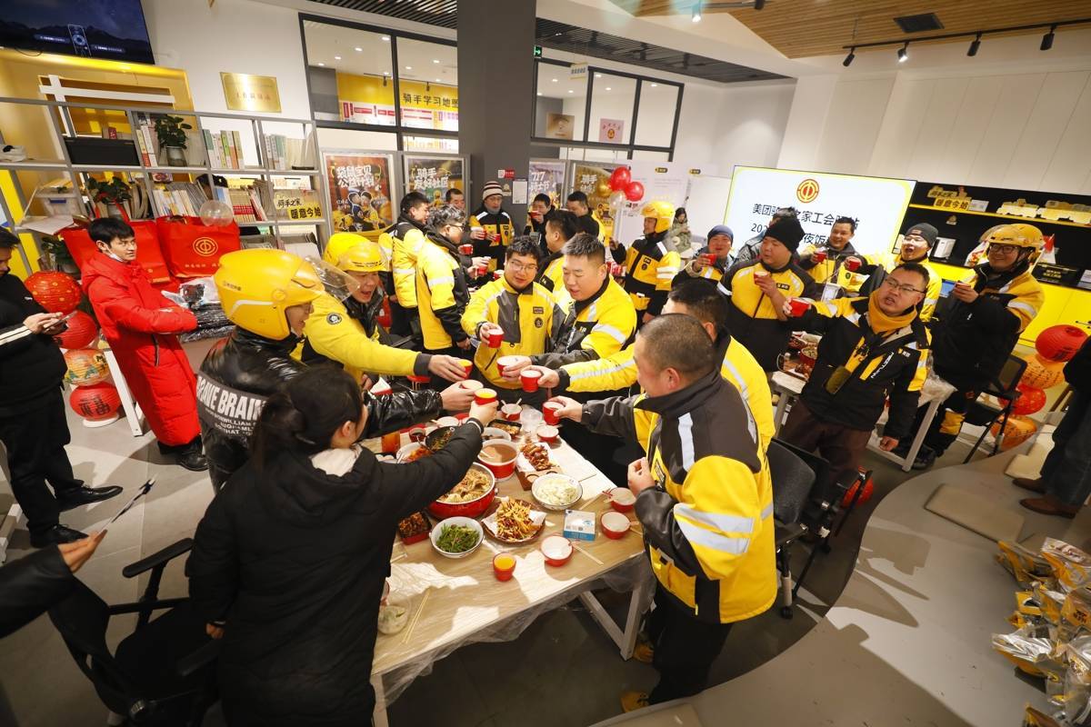 放下外卖箱,端起团圆碗!2月9日下午,美团武汉光谷工会驿站里格外热闹。30多位外卖骑手暂时停下奔波的脚步,聚在一起擀皮、调馅、包饺子。驿站变成了临时的“家”,没有催单声,只有歌声、笑声和饺子的热气一起蒸腾。这场特别的年夜饭,没有订单提醒,只有满满的“家”味。美团武汉光谷工会驿站负责人表示,就想用这顿团圆饭,谢谢骑手们一年的风雨无阻和辛勤付出,愿他们在驿站感受到家一般的温暖。(湖北日报全媒记者 李溪 通讯员 杨健 摄)