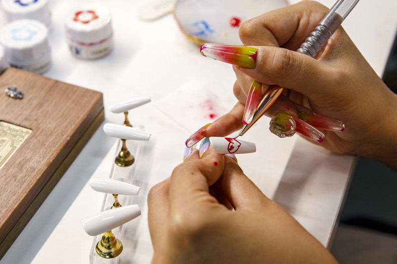 美甲设计师苗强丽说:“我在甲片上画青花、绘祥云,感觉是把我们的文化戴在手上,传播出去。我们做的不仅是一件商品。”