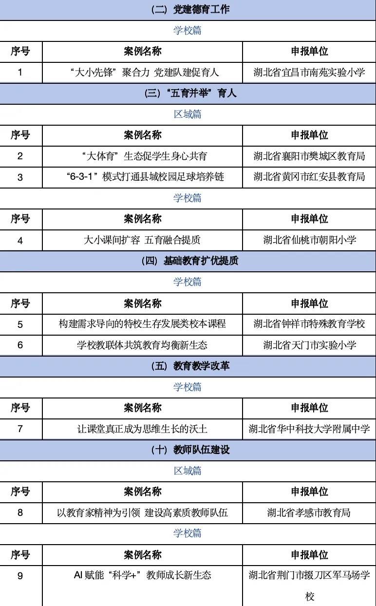 “教师队伍建设”类别中,孝感市教育局以教育家精神引领高素质教师队伍建设,荆门市掇刀区军马场学校则借助AI技术赋能“科学+”教师成长,体现了教师队伍建设中的理念创新与技术融合。