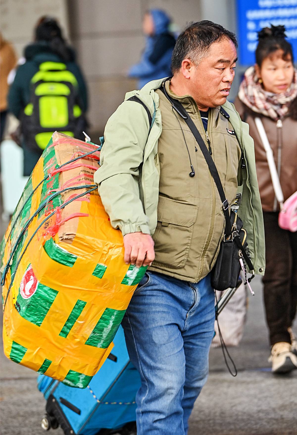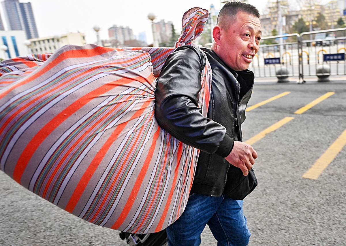 2月9日,武昌火车站,旅客带着大包小包行李返乡,有的或扛或挑沉甸甸的蛇皮袋,手提塑料桶,有的肩背用床单打包的行囊,看似简陋的装备,装满的是深厚的生存智慧与情感温度。