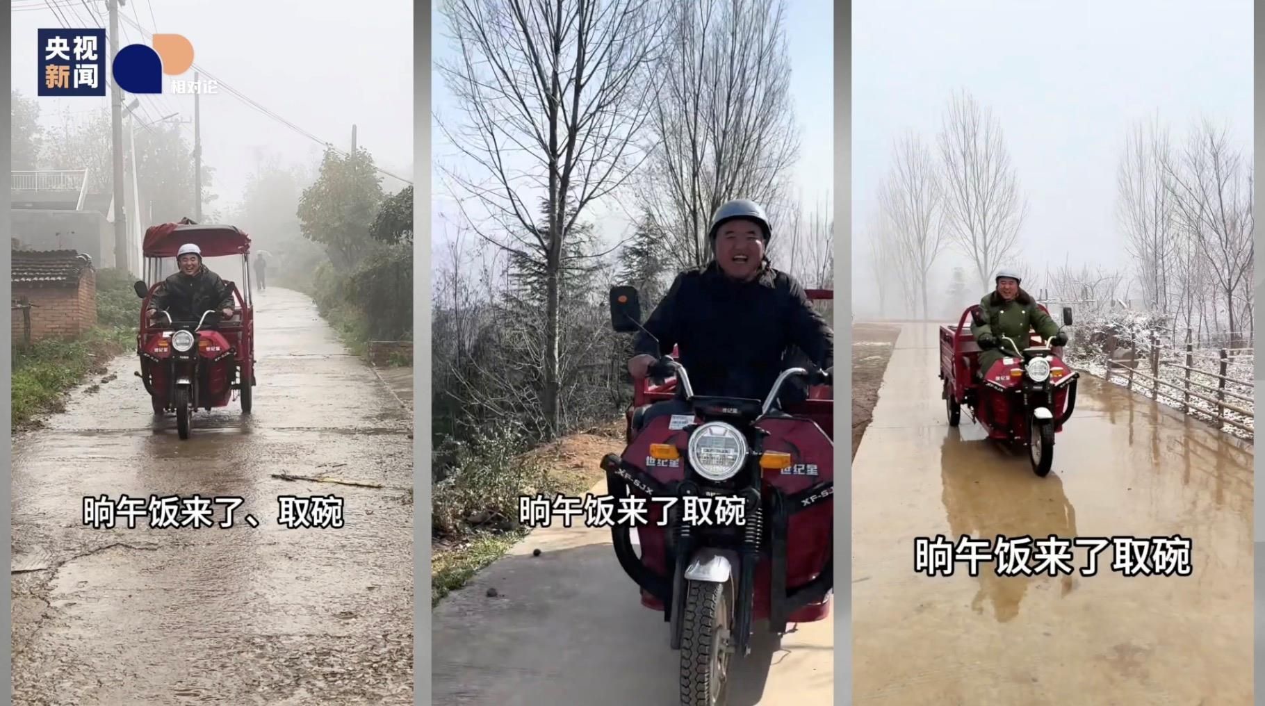 送饭路上,老人状况不断——今天爷爷只要了一碗饭,婆婆没有要,怎么了?得进屋看看;有老人在家摔倒了,幸亏送饭时发现,送到了医院;手机连不上网,残疾证怎么办……家长里短的问题,每天都能有个回应。