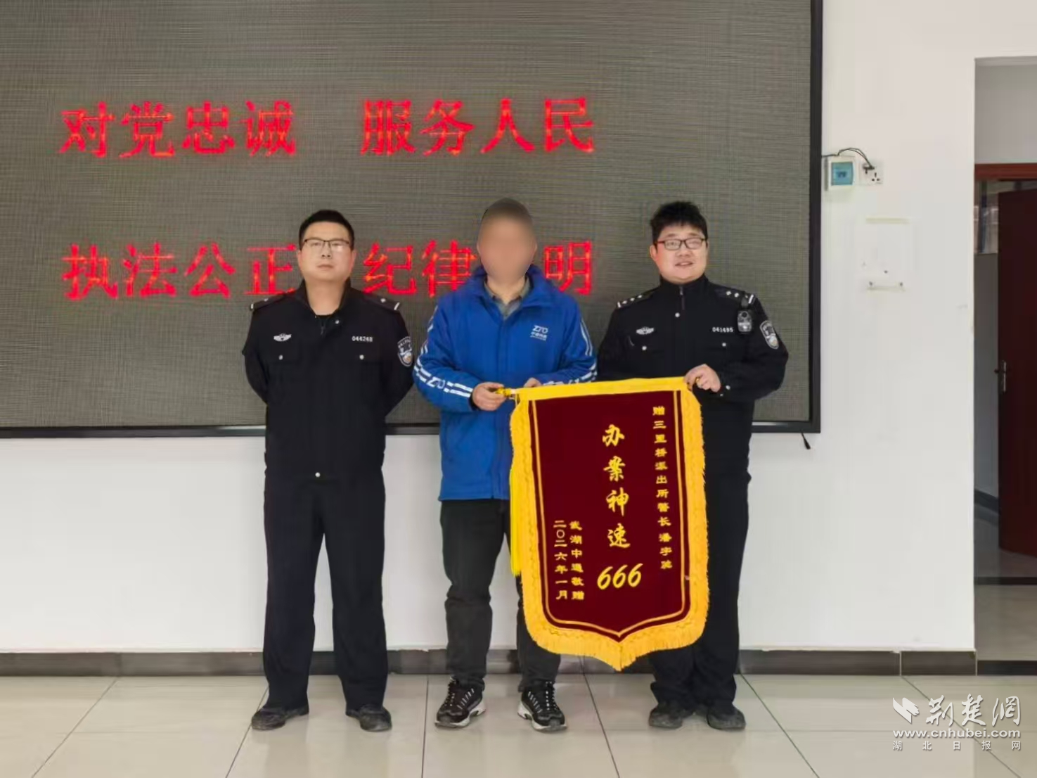 荆楚网(湖北日报网)讯(通讯员 吴雪薇、钟侦月)1月28日,一面写着“办案神速666”的大红锦旗,送到了长江新区公安分局三里桥派出所。送锦旗的快递网点负责人笑着说:“不只是感谢警方快速破案,更感谢他们及时提醒,为我们日常管理敲响了警钟。