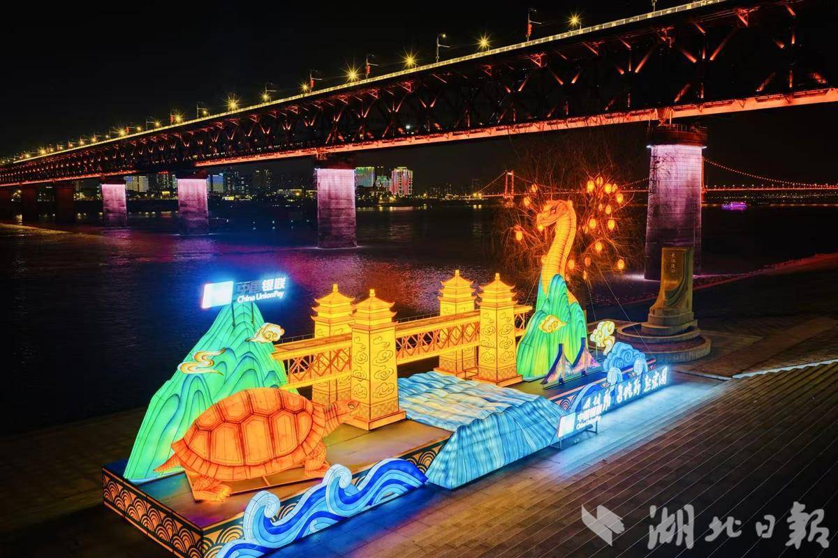 现场,从朝宗门至禹王矶,千米长江岸线铺展开近万平方米的璀璨灯海。摇曳的灯光倒映在粼粼江面上,与矗立于长江两岸的晴川阁、黄鹤楼等地标交相辉映,呈现出一幅“江汉揽胜”新图景。