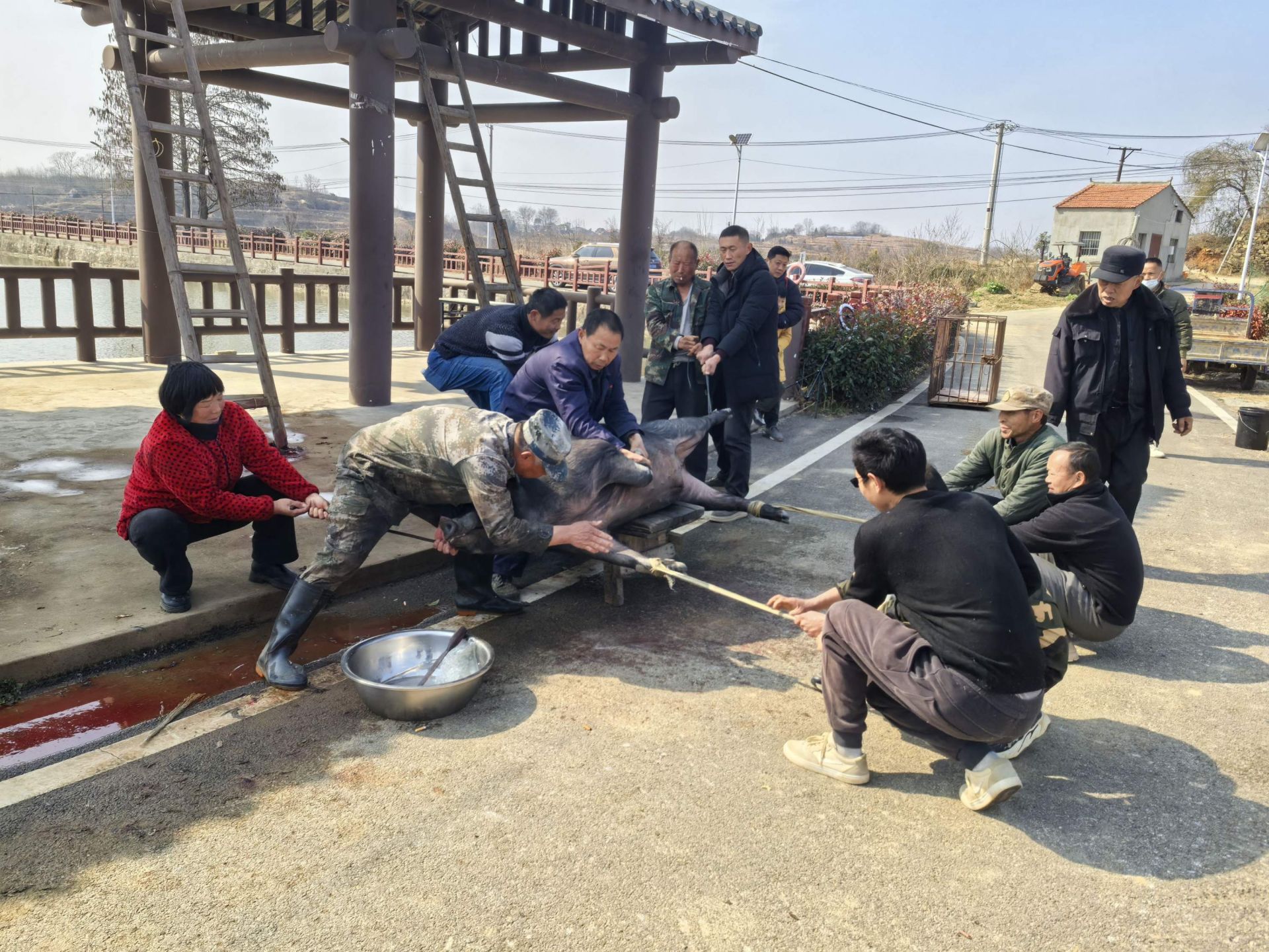 “捉。”随着一位长者大喝,年猪从笼中冲出,七八名壮汉一拥而上,按头、抱腰,绑住猪脚。突然,年猪猛地蹬腿,眼看就要挣脱,一旁,一名正在现场拍摄的拍客立即上前,帮忙按住猪腿,众人齐心合力将年猪按倒。