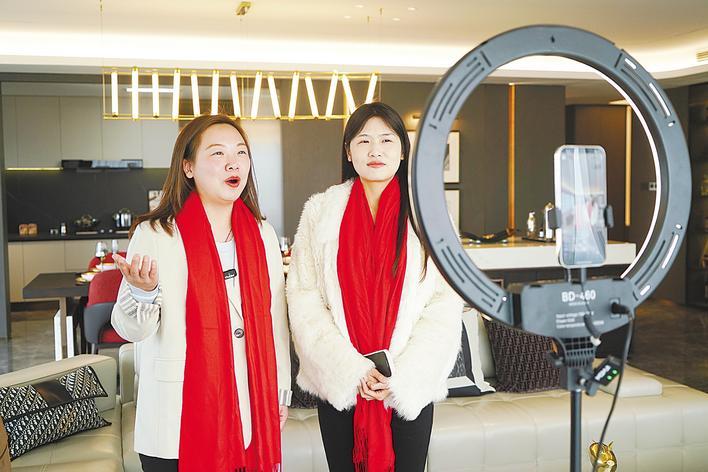 湖北日报全媒记者(右)和网红“襄阳白菜”一起直播打年货。(湖北日报实习生 高子涵 摄)