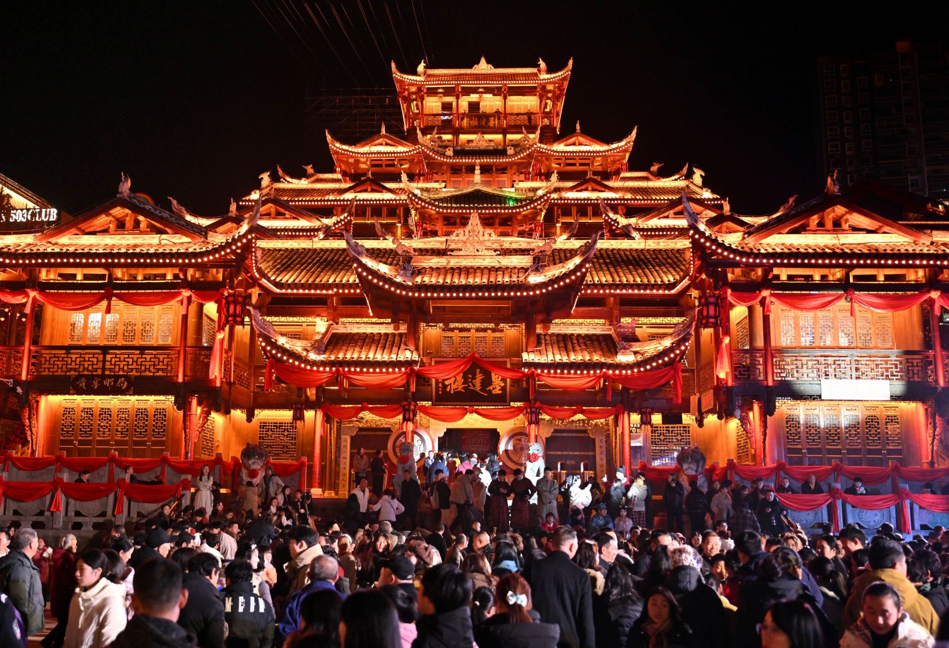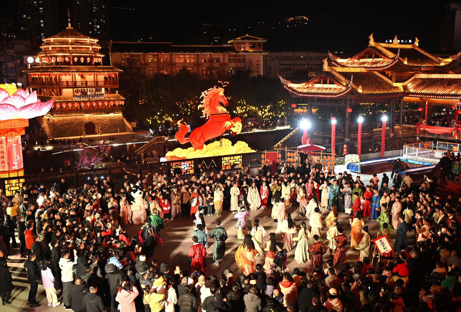 荆楚网(湖北日报网)讯(记者 曾甜 通讯员 陈维)夜色低垂,贡水河畔灯火璀璨,人潮涌动。33艘竹筏组成的264米“长龙”蜿蜒于河面之上,与不远处兴隆老街、文澜桥、墨达楼的灯光交相辉映。