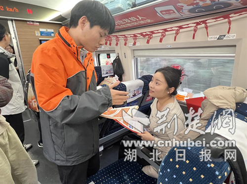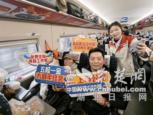 “老乡们,旅途漫漫,我们准备了一些小节目,欢迎大家一起参与!” 工作人员手持话筒,热情地在车厢间互动。一曲《梦里水香》悠扬响起,瞬间吸引了满车厢旅客的目光与掌声,没有炫目的灯光,唯有真情最为动人。英文歌曲、广场舞等快闪节目轮番登场,引得全场喝彩,两位“最美家乡代言人”改编的荆门版《成都》,唤醒了熟悉的乡愁。一曲思乡,踏歌归乡,集体合唱的《常回家看看》,更是让许多人湿润了眼眶。浓浓的乡音,开怀的笑声,炽热的年味扑面而来,构成一幅幅美妙和谐的画面。