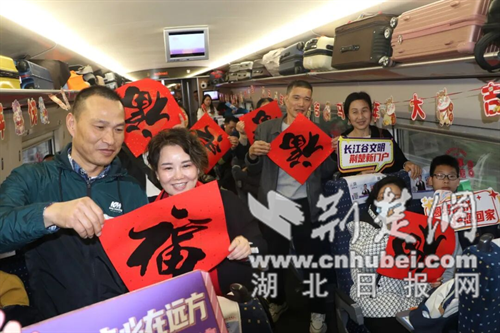 专列车厢里,贴着福字窗花,行李架上挂着吉祥马,小红灯笼布满车厢,“荆门接您回家”“马踏春风启新程,功成必定在家乡” 等新年祝福随处可见。荆门市人社部门精心准备,组织分送春联、拍摄并送上全家福,举办老乡歌会、创业分享会等特色活动。