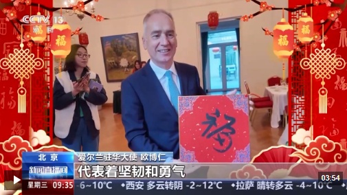 爱尔兰驻华大使 欧博仁:春天将至,白昼渐长……这是安东尼·拉夫特里写于17世纪的一首咏春诗。我谨代表爱尔兰人民,祝大家新年快乐、万事如意。