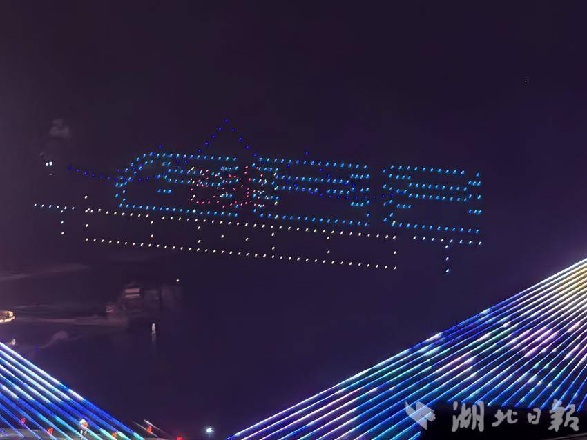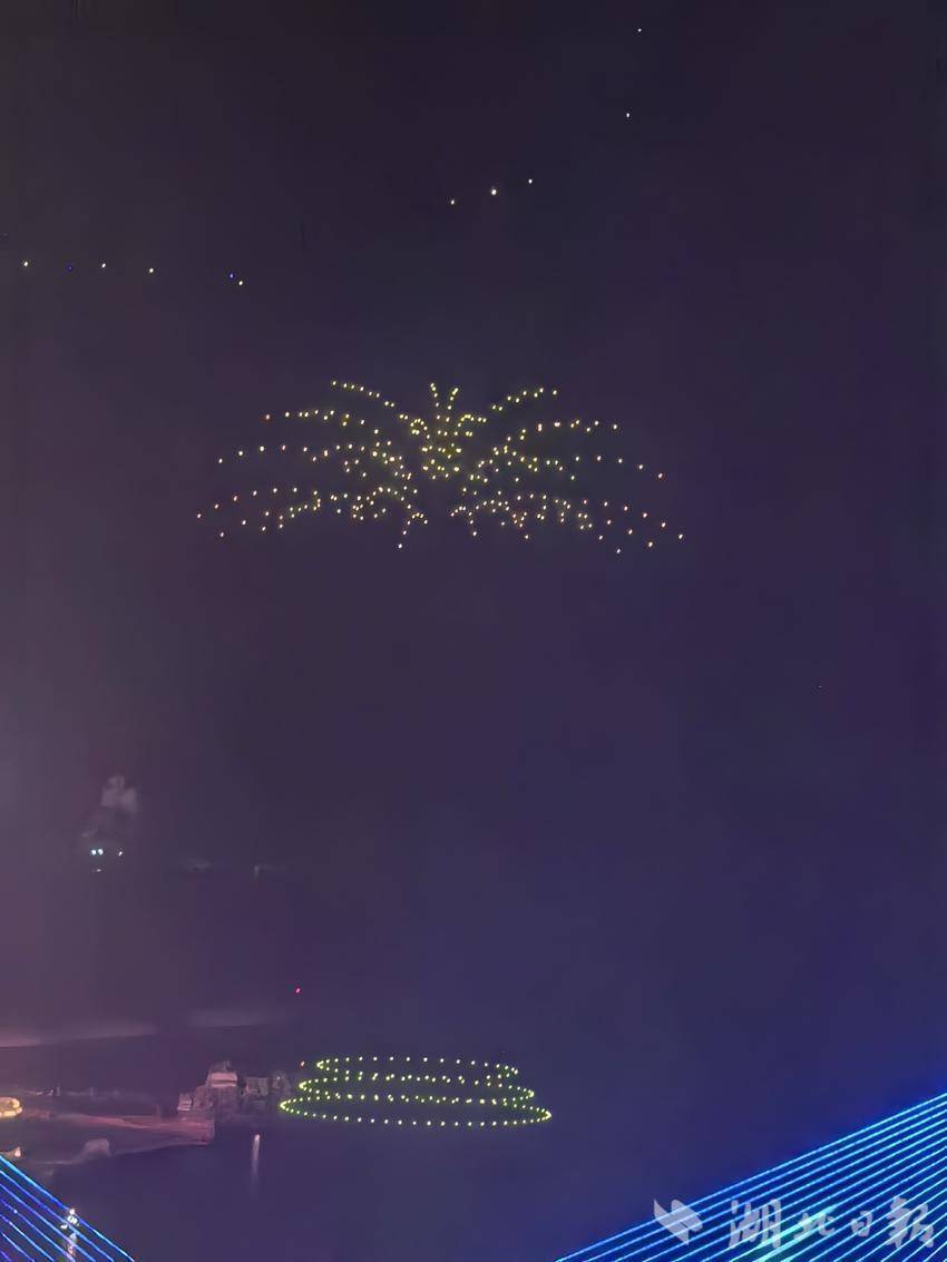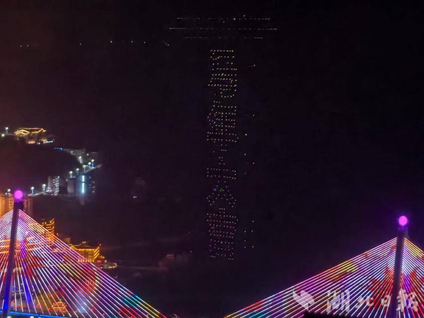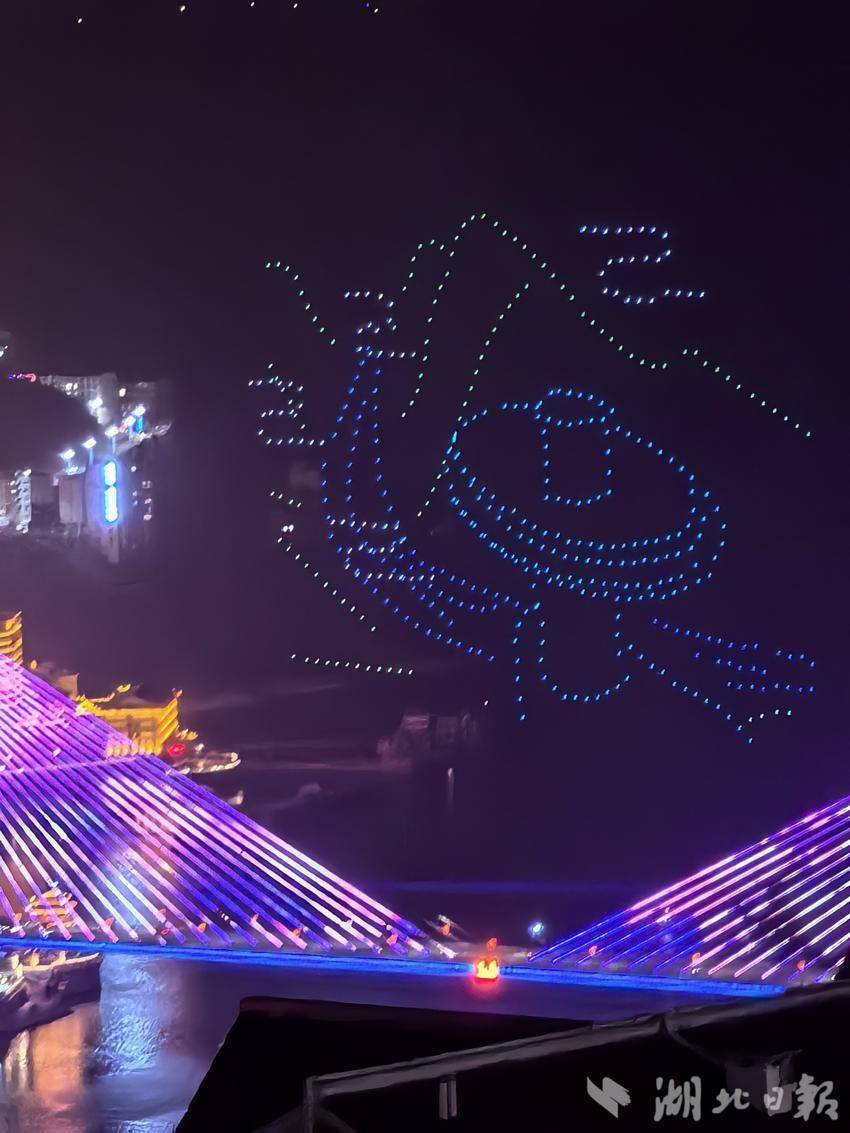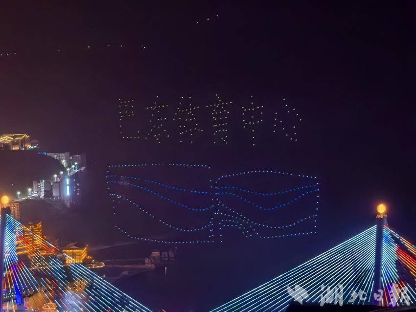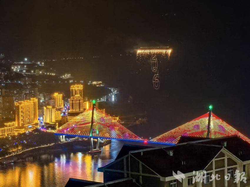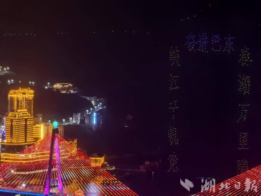 夜幕下,亲水广场前人潮涌动,市民游客翘首以盼。伴着新春旋律,无人机编队缓缓升空,点点星光点亮峡江夜空。表演中,阵型精准变换,点亮巴东璀璨时刻。