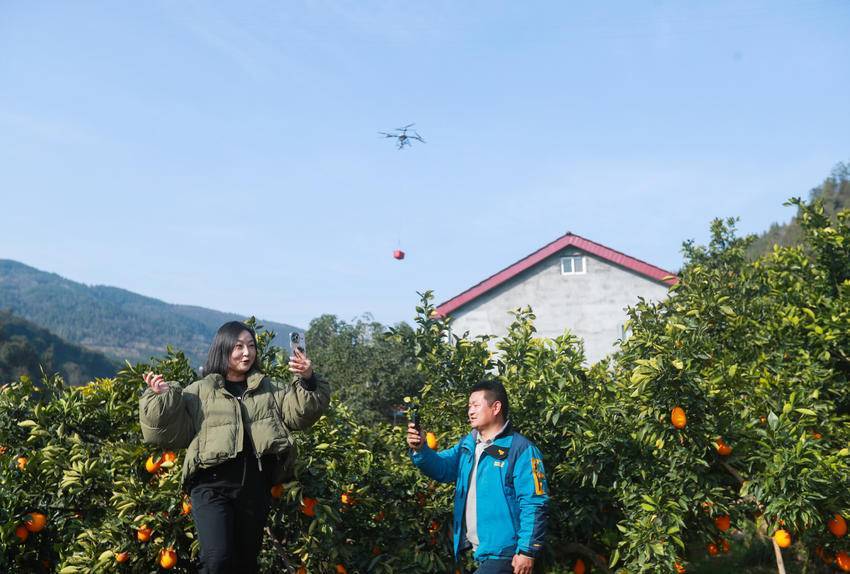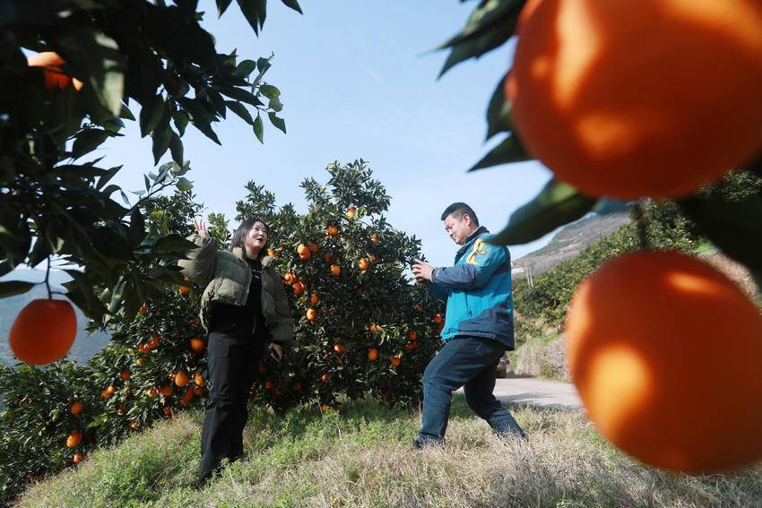 2月10日,在湖北省秭归县两河口镇太坪村,电商主播向春燕(左)和助理拍摄抖音视频售卖鲜橙。