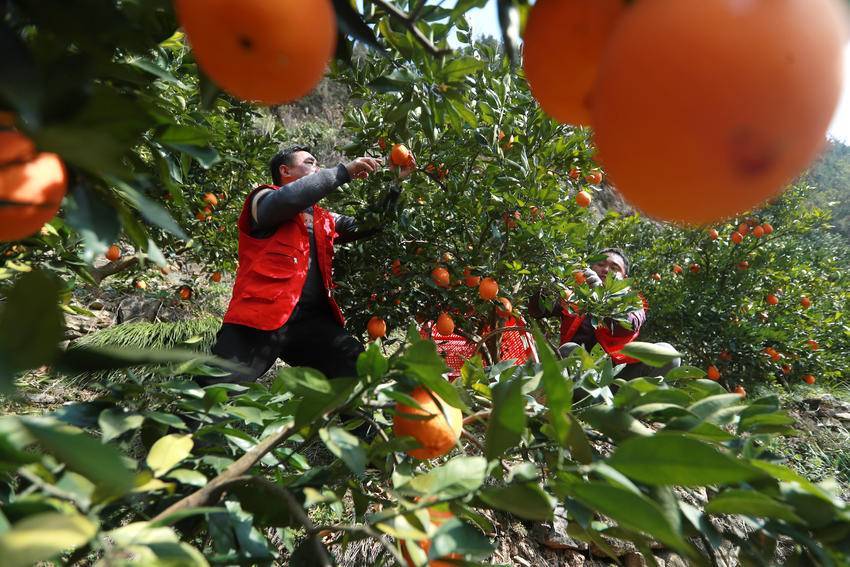 2月10日,湖北省秭归县两河口镇太坪村采果队员在田间采摘新鲜橙子。