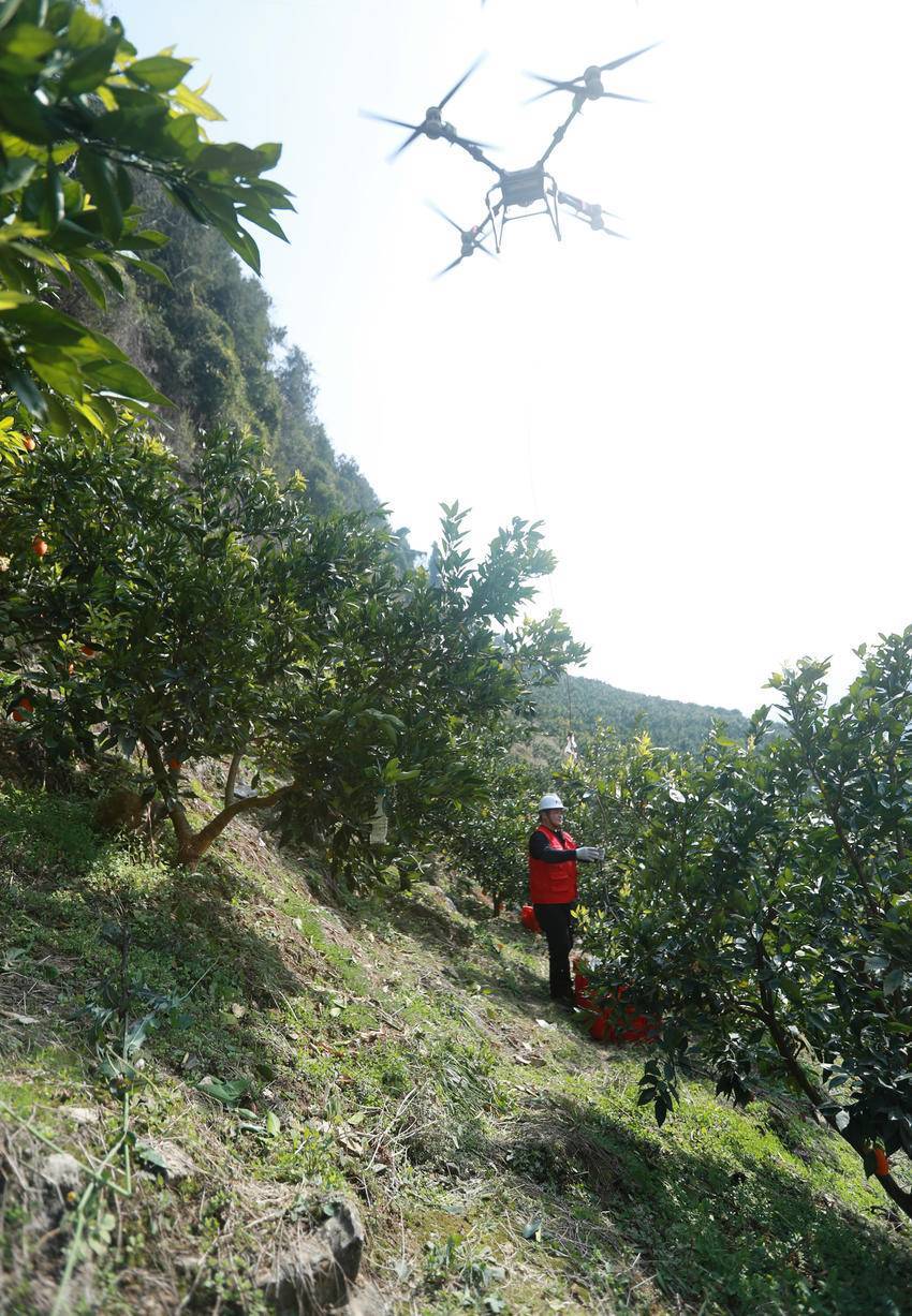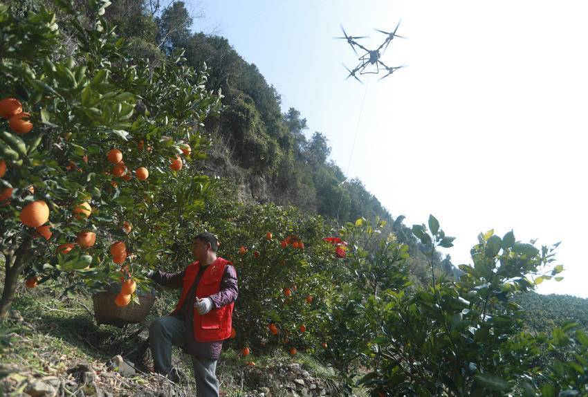 2月10日,湖北省秭归县两河口镇太坪村,采果队员操控无人机在田间转运新鲜橙子。