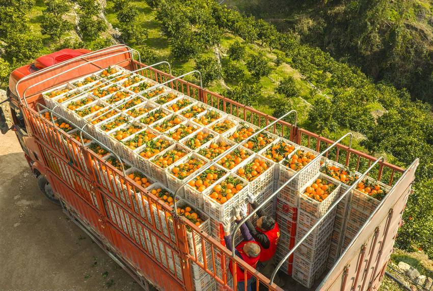 2月10日,湖北省秭归县两河口镇太坪村采果队员将刚采摘的新鲜橙子装车外销(无人机照片)。