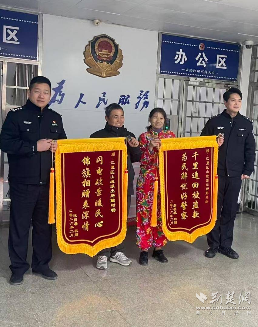 荆楚网(湖北日报网)讯(通讯员 谈小珂、汤文慧)2月9日,江夏区公安分局山坡街派出所门前锣鼓喧天、喜气洋洋,一群广场舞阿姨自发组成临时“锦旗锣鼓队”,身着节日盛装,敲锣打鼓为民警鲍树杨送上两面锦旗,用最热闹、最质朴的方式,致谢这位千里跨省为民追回钱款的暖心民警。