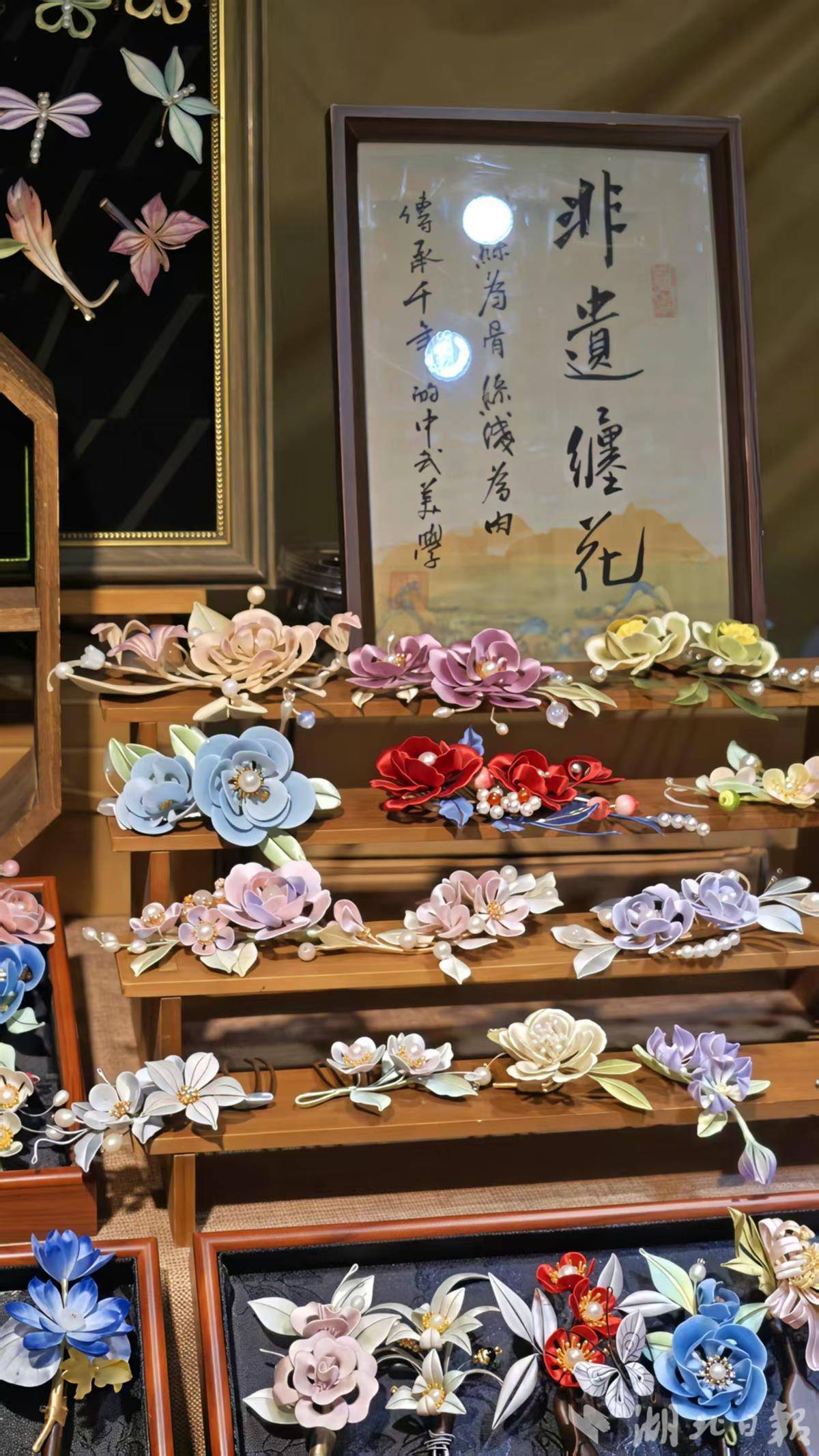 在市集非遗专区琳琅的摊位中,一个摆满缤纷丝线花饰的角落尤为醒目——嫩粉的梅、宝蓝的菊、柿红的果,在灯光下泛着柔和光泽。