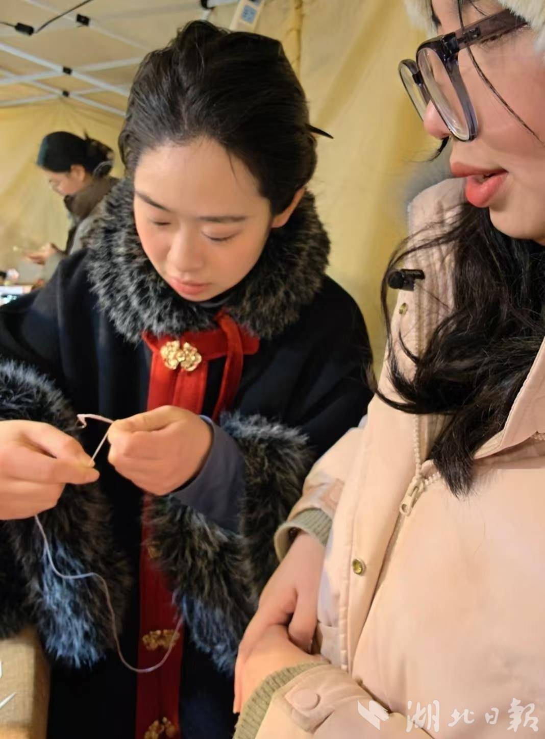 记者体验缠花手工(隔壁摊主“面包姐”摄)