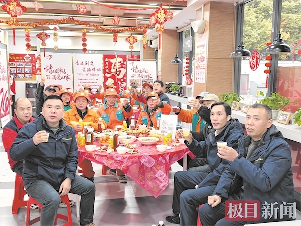 楚天都市报极目新闻讯(记者张盼 杨琛源 通讯员杜少华)北方小年团圆夜,荆楚烟火暖人心。2月10日晚,中国石化湖北武汉石油头道街加能站内暖意融融,一盆盆红亮鲜香的潜江龙虾搭配地道荆楚菜肴,摆上特殊的小年团年宴。环卫工人、货车司机等城市守护者与赶路人围坐一堂,在虾香氤氲中,感受异乡团圆的温情,缓解奔波的疲惫。