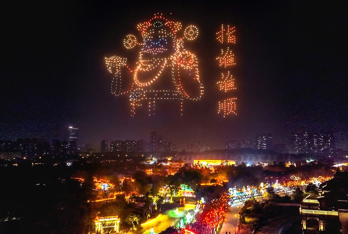 11日喜庆过小年。武汉园博园花灯会游人如织,仰望夜空有大戏:千台无人机在空中为大家送上新春祝福画卷。
