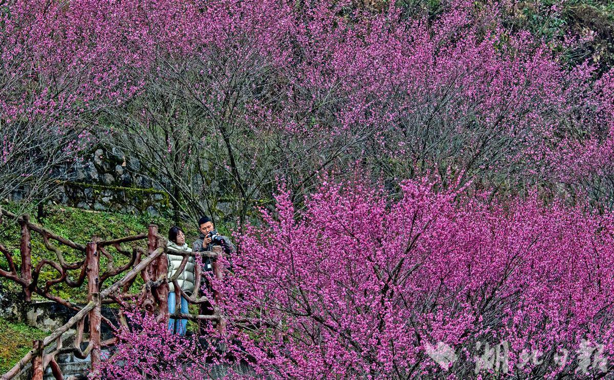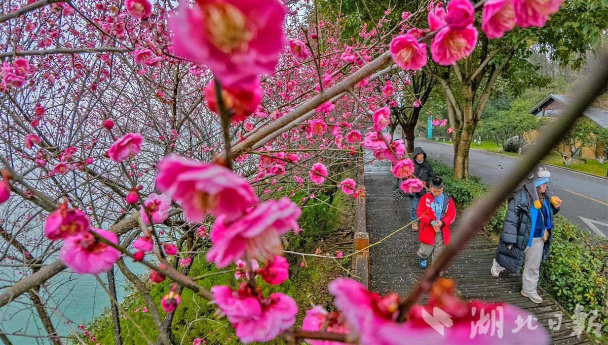 2月9日,秭归县屈原故里文化旅游区内,腊梅迎着寒意悄然绽放,三峡大坝前的库区岸边,连片梅花竞相吐蕊、缀满枝头,粉白、金黄的花瓣在清风中摇曳生姿,生机盎然,与景区古色古香的人文风貌相映成趣。眼下正值秭归长江岸边梅花观赏佳期,盛放的梅花不仅扮靓了城乡景致,更吸引了不少市民游客慕名前来赏梅、打卡,沉浸式感受冬日里的梅韵温情与三峡库区的生态之美。(湖北日报全媒记者 刘曙松 通讯员 彭强 韩露 摄)