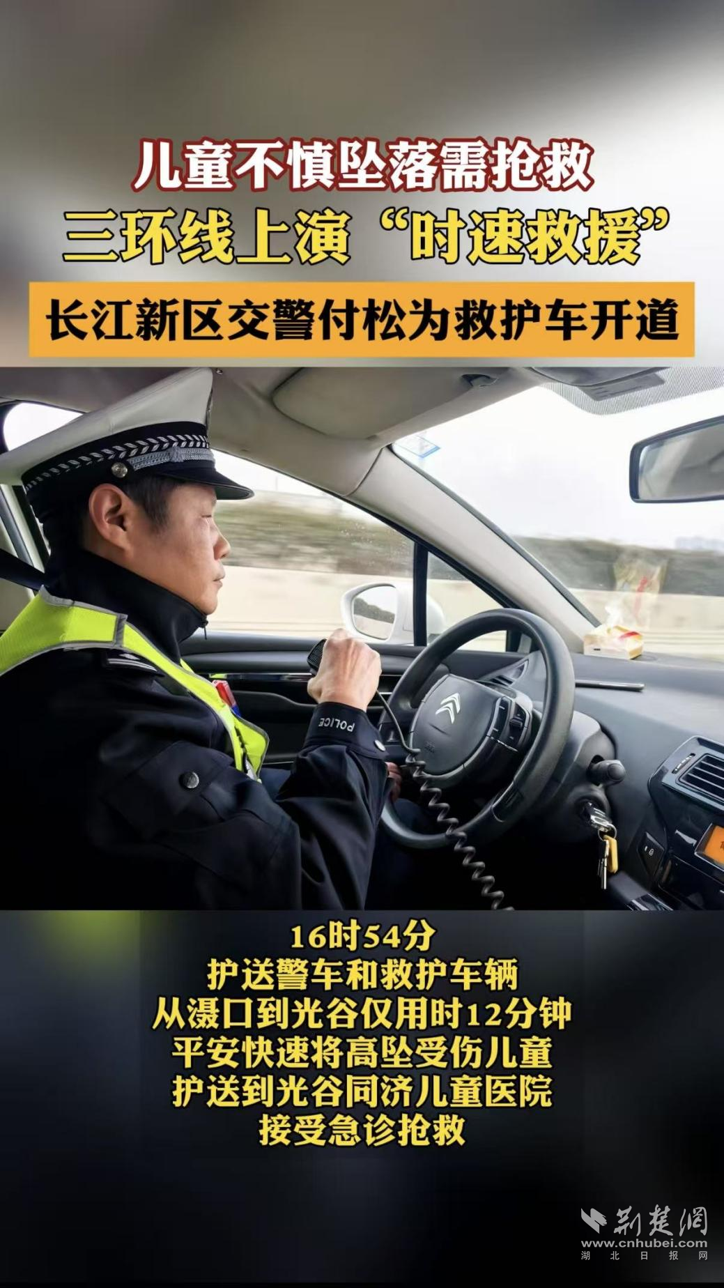 “有个孩子高坠受伤,要马上送到光谷同济儿童医院,请帮帮我们!”接到这通紧急呼叫,大队迅速响应,一边对接救护车,一边指派民警付松和辅警饶耀赶往滠口高速出口提前等候,亮灯鸣笛,开道护航。载着患儿的救护车仅用12分钟,便在警车护送下穿越三环线车流,安全抵达医院,为救治赢得了宝贵时间。
