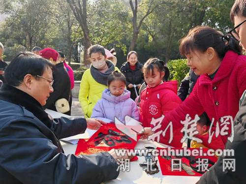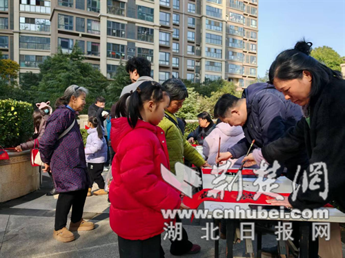 荆楚网(湖北日报网)讯(通讯员 李春节 尤运锋)2月11日下午,在荆门市掇刀区凯旋湾小区大喷泉广场,一场别开生面的“翰墨飘香迎新年 春联纳福进家门”写对联送福活动拉开序幕。