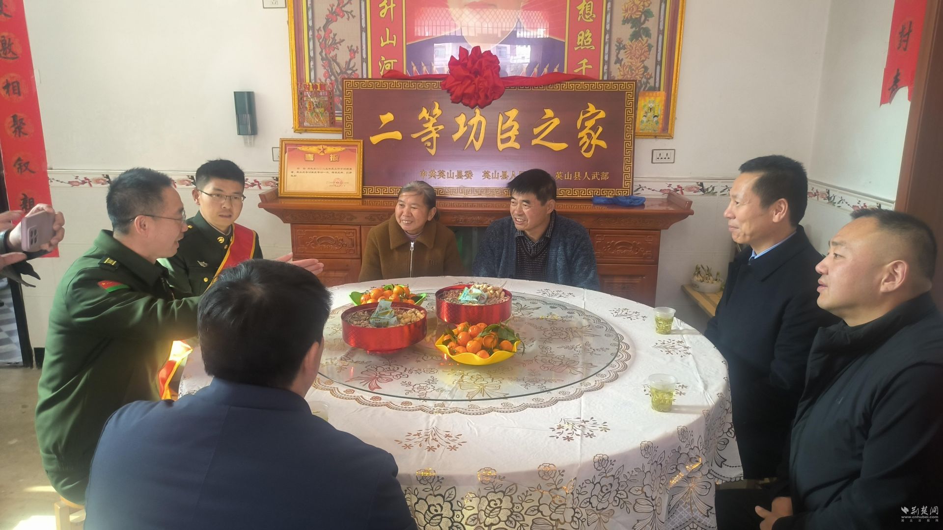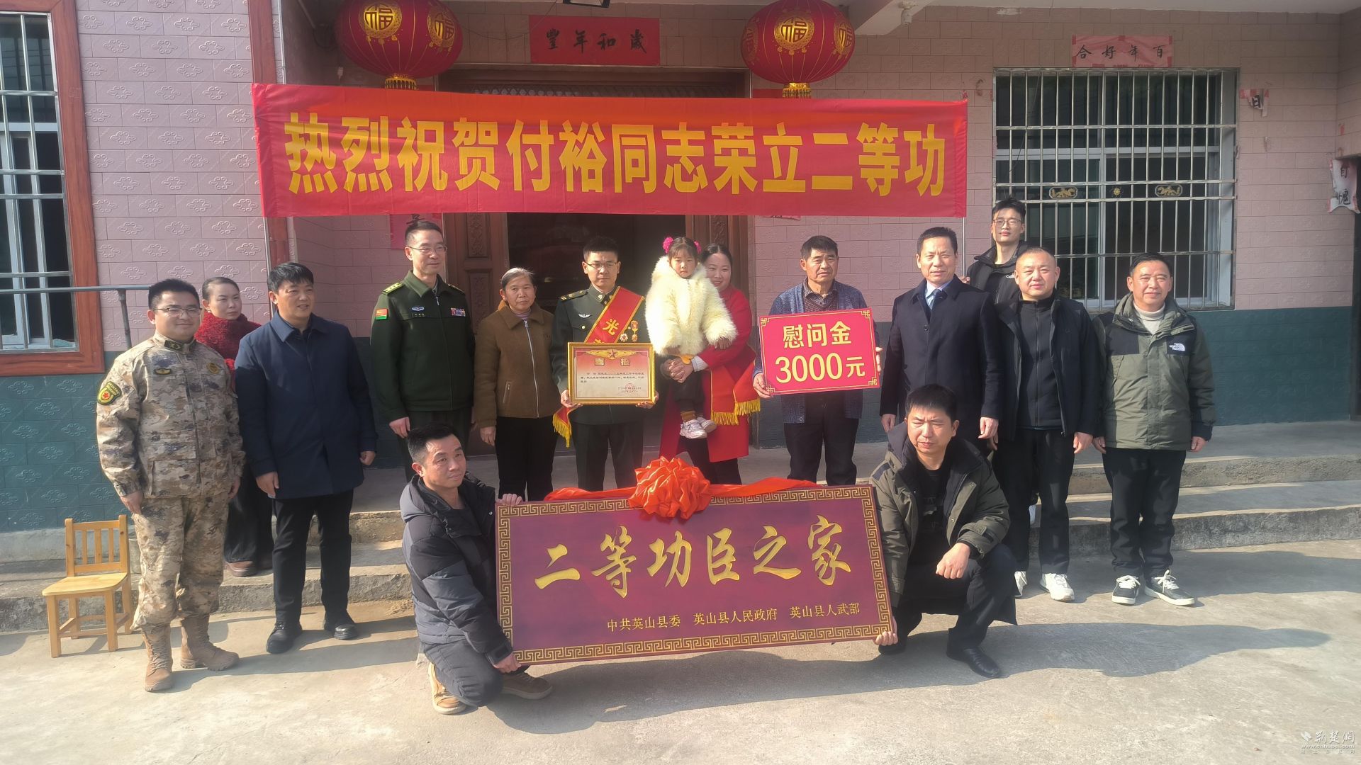 荆楚网(湖北日报网)讯(通讯员余炀、吴则)2月11日,伴随着喧天锣鼓声,由英山县人武部、县退役军人事务局、南河镇共同组成的送喜报小组,来到傅家坊村现役军人付裕家中,为其家属送上付裕荣立二等功的喜报和奖励金。英山县委常委、县人武部部长许艳阳,县政府副县长、县公安局局长涂新斌参加送喜报活动。