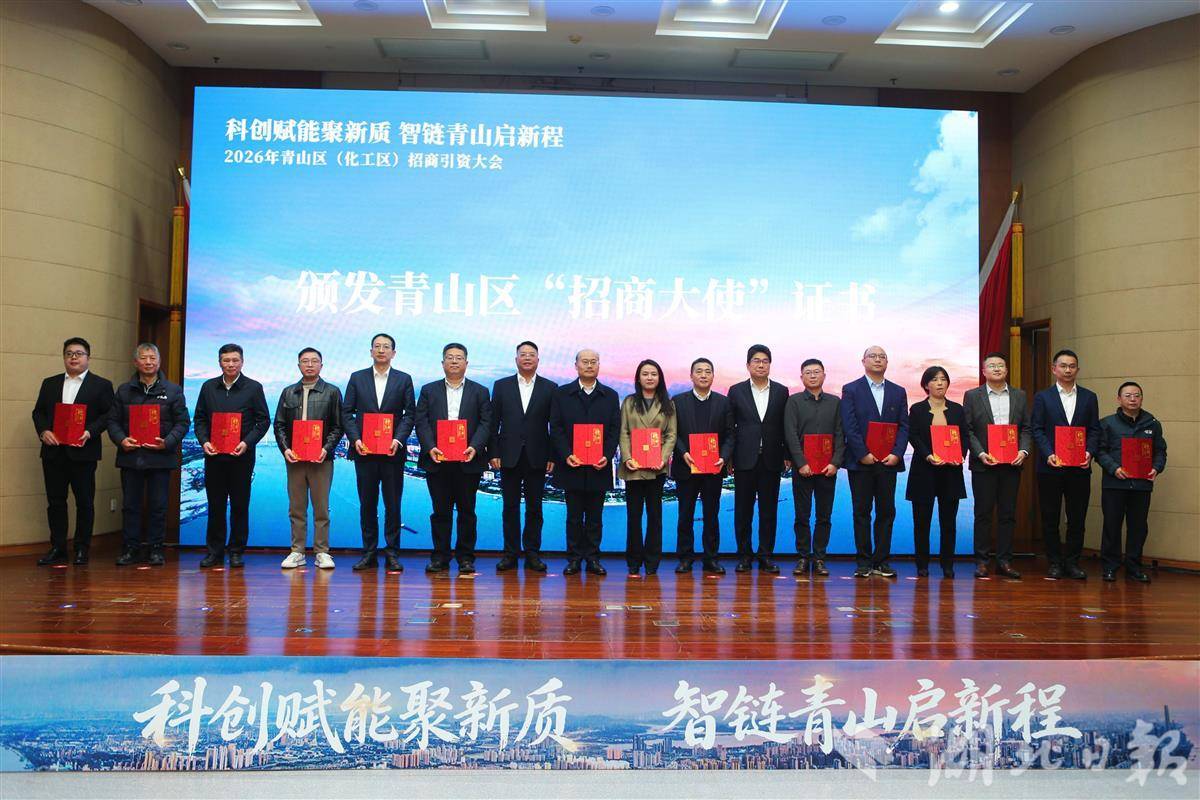 湖北日报讯(记者余瑾毅、通讯员魏涵玉)2月10日,“科创赋能聚新质 智链青山启新程”2026年青山区(化工区)招商引资大会召开。会上,中国联合工程有限公司、海亮集团有限公司、石大胜华新材料集团股份有限公司、武汉利楚商务服务有限公司等15家企业受聘为青山区“招商大使”,涵盖化工、金融、能源、文化等多个领域,将充分发挥行业影响力和资源优势,积极牵线搭桥,精准引荐优质企业、重点项目,助力青山构建更具竞争力的现代化产业体系。