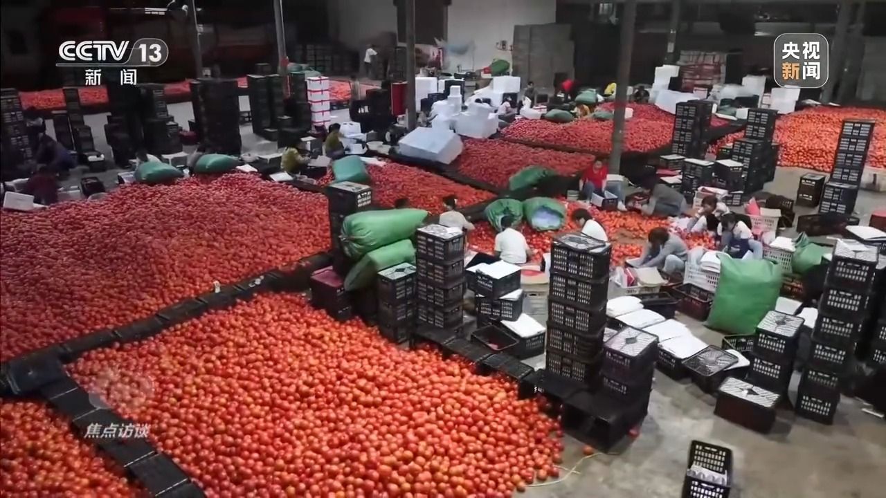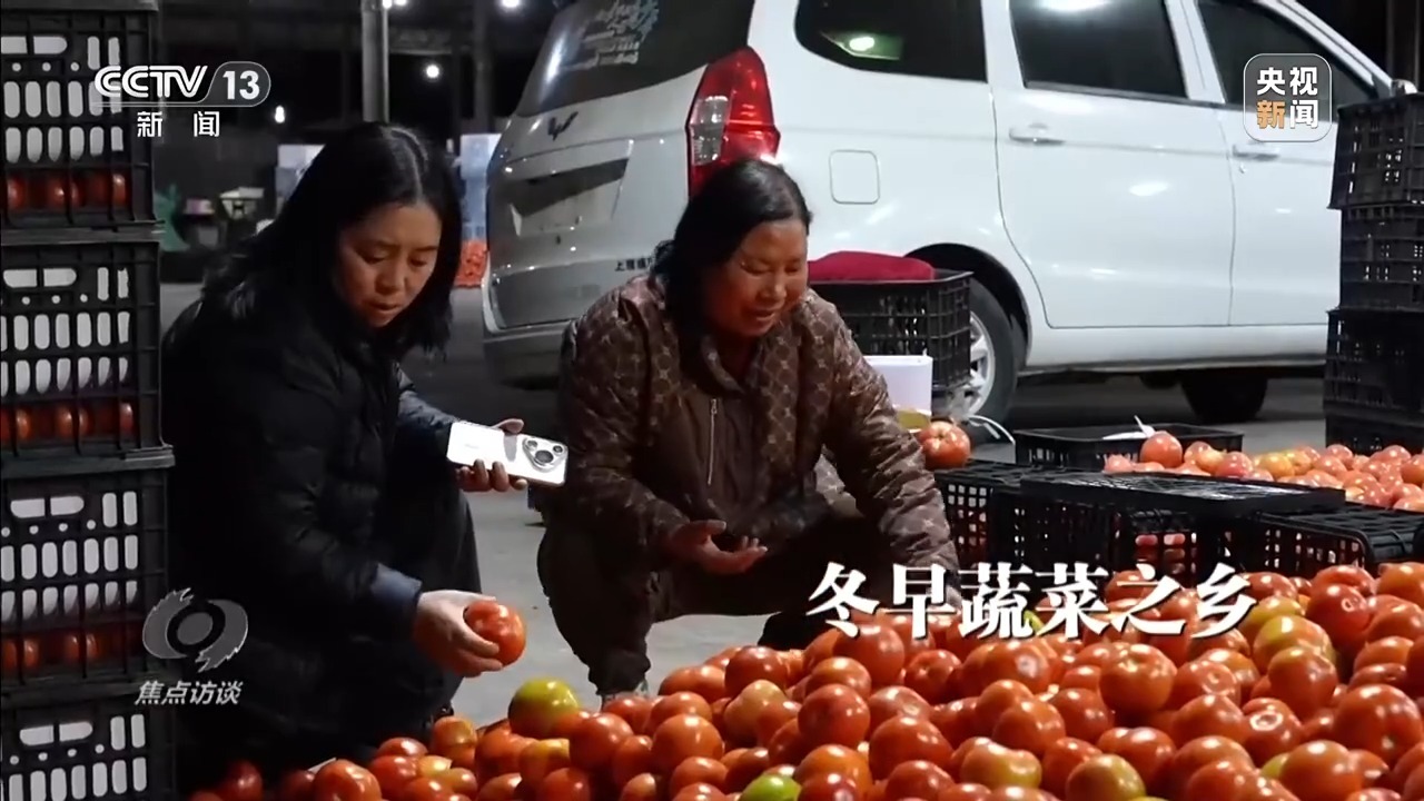 云南楚雄彝族自治州的元谋县,位于滇中高原北部,是著名的蔬菜种植大县。凭借得天独厚的气候优势,这里成为冬日里的“天然菜园”。每到冬天,西红柿、黄瓜、豆角等新鲜蔬菜在这里集中上市,其中西红柿是当地种植面积最广、交易量最大的当家品种。元谋县的能禹蔬菜批发市场,则是这些新鲜西红柿的核心集散地。这里日夜繁忙,见证着一颗颗的元谋西红柿从田间走向全国。新春走基层,记者就来到了能禹市场,从这里出发,探访元谋“南菜北运”背后一个个鲜活的奋斗身影。