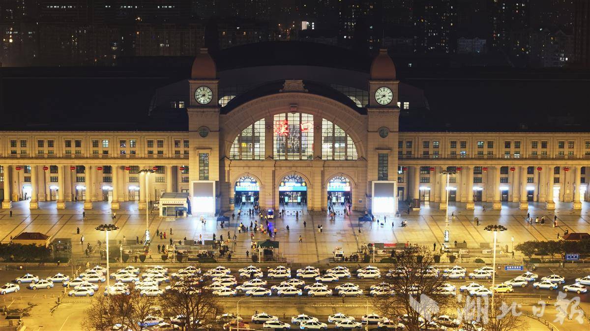 夜幕中,汉口火车站灯火通明。春运期间,站前广场人流涌动,密集的车辆在灯光映照下,如一条条银色的链条,在道路上有序流转、蜿蜒前行。全国高铁路网持续扩容,湖北“市市通高铁”,铁路部门加密车次,有效分散旅客出行;铁路与交管部门协同发力,强化现场疏导与车辆管控。运力提升与精细管理双管齐下,共同编织出这幅灯火通明、繁忙却井然有序的春运画卷,为归途筑牢坚实保障。(湖北日报全媒记者 陈少哲 摄)
