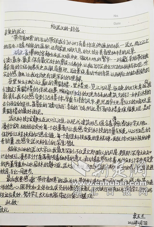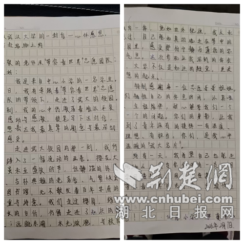 荆楚网(湖北日报网)讯(通讯员 曾琴 王宇凡)近日,随着最后一名学生平安抵达荆门市东宝区仙居乡家中,由省委社会工作部统筹的2026年“带你看世界”志愿助学项目圆满收官。来自东宝区仙居乡仙居中心小学、仙居中学的40名乡村学生,在返程中用文字与画笔致信武汉,留下这段难忘的成长印记。