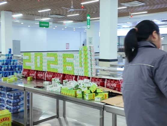 距离生产车间不远的员工餐厅里,“2026金马贺岁”的标牌格外醒目,工作人员正在饮料台上摆放可乐、牛奶和啤酒。宜昌邦普全链条一体化产业园后勤主管董军介绍,“今天过小年,公司准备了新春家宴,供应2000人的自助餐,牛肉、基围虾、烤鸭等一共十个菜,寓意十全十美,量大管够,让留岗员工感受到家的温暖。”