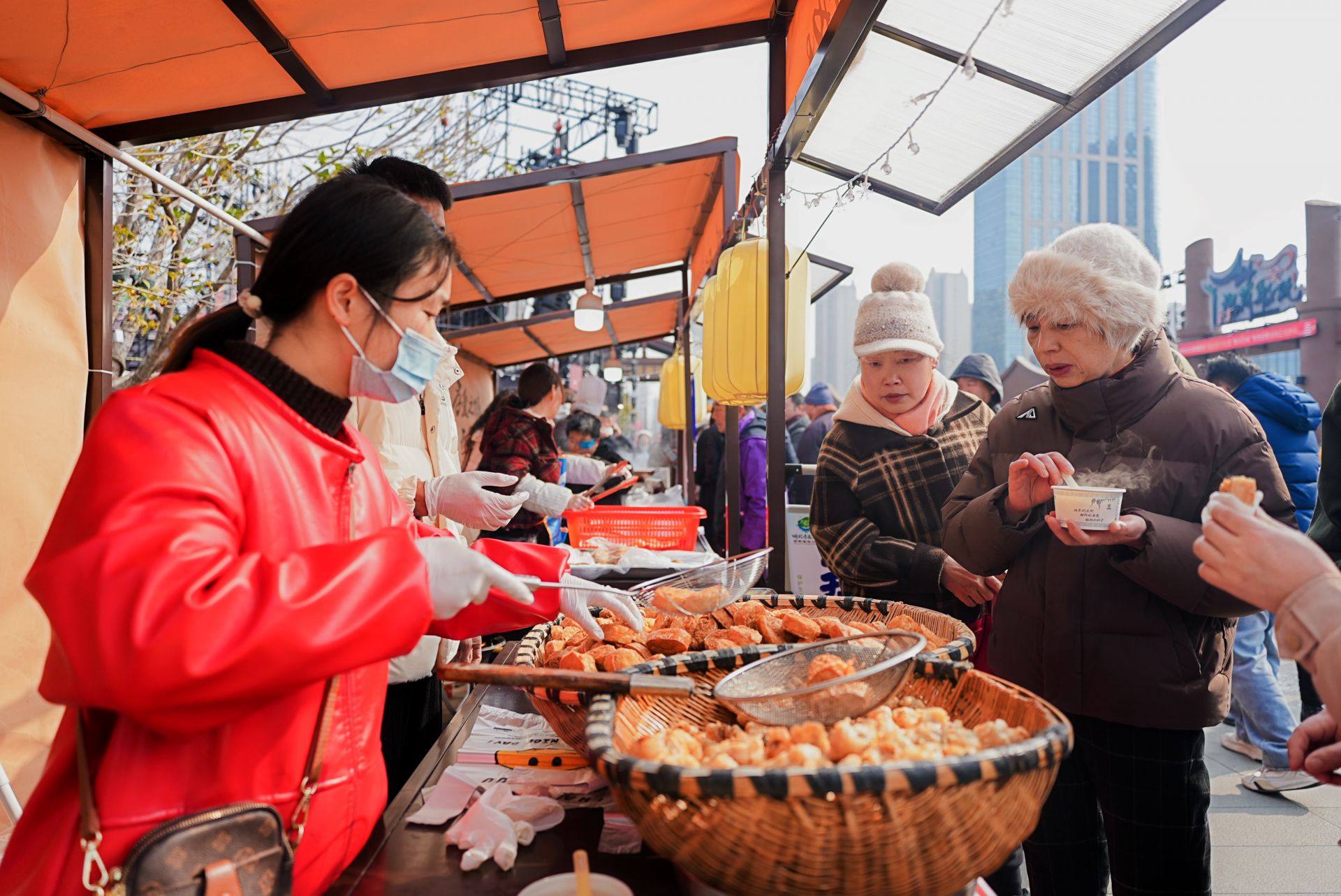 民俗街区灯笼高悬,八仙桌美食区香气扑鼻,舞狮、采莲船巡演轮番上演,孝感雕花剪纸、麦秆画等非遗项目展示引得市民、小朋友驻足体验。年味市集上,春联书写、传统年货、特色小吃摊位错落有致,孝感麻糖、米酒、炒货等美食香气四溢。