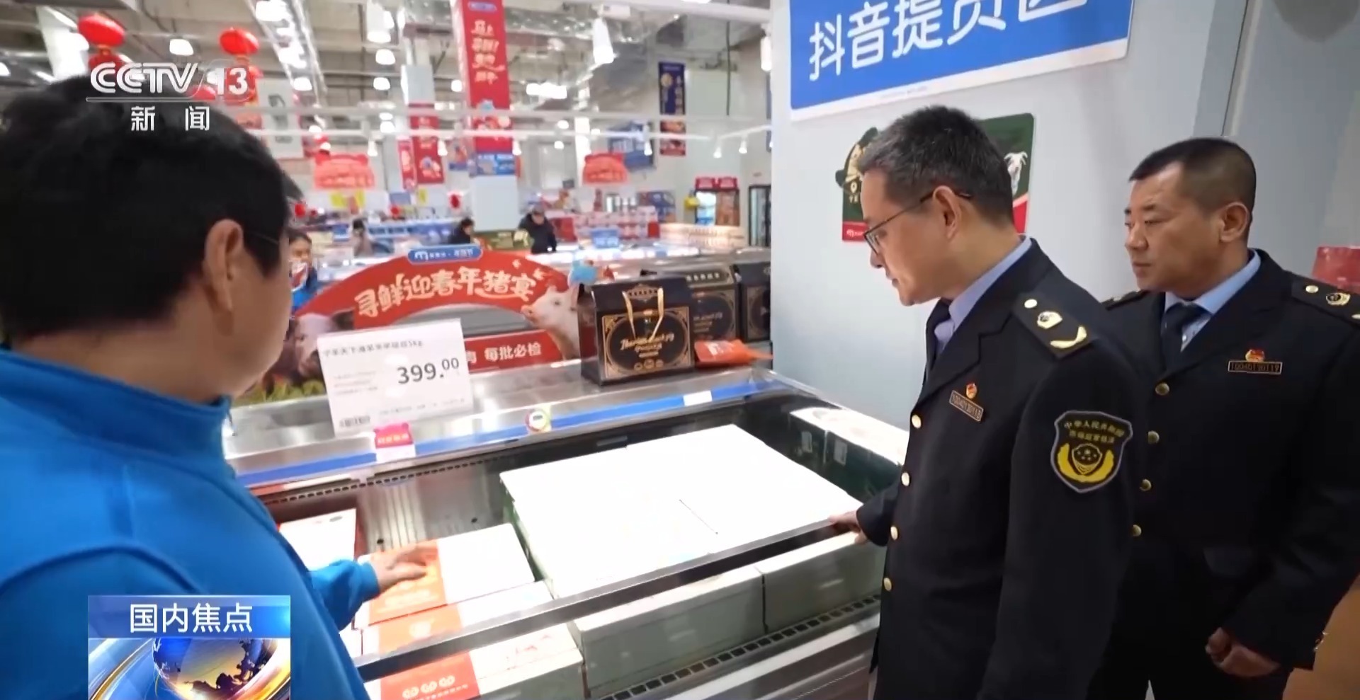 在常州天宁区一家大型购物中心,执法人员首先对春节热销的畜禽肉类礼盒进行现场核查。
