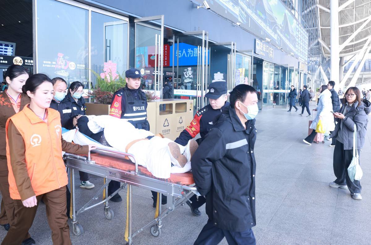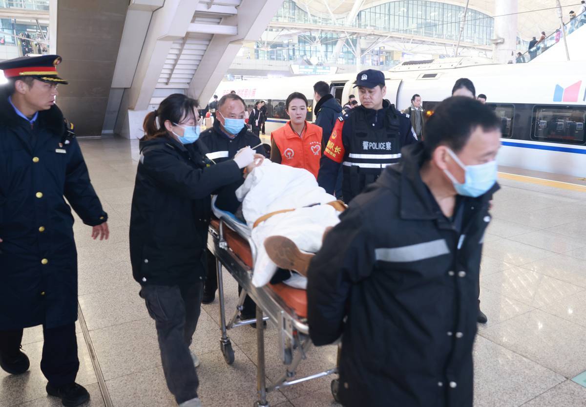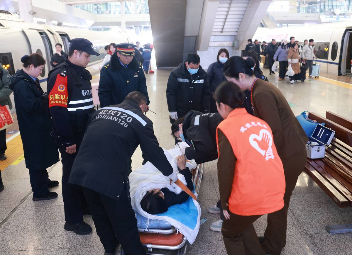 2月12日,武汉火车站,一位旅客突然晕倒在站台,幸得多方紧急救助后转危为安。当天9时40分许,潜江来武汉过年看望儿子的刘女士,刚下火车就突然晕倒在站台上。正在站台上执勤、服务的铁路民警、车站工作人员、武汉客运段志愿者立刻赶到刘女士身边施以援手,并第一时间联系医护人员赶往现场。120急救人员到场后,众人一路将刘女士护送上救护车。据了解,刘女士送医后生命体征平稳,家属已赶往医院。(湖北日报全媒记者 魏铼 通讯员 李鹏翔 余梦青摄)