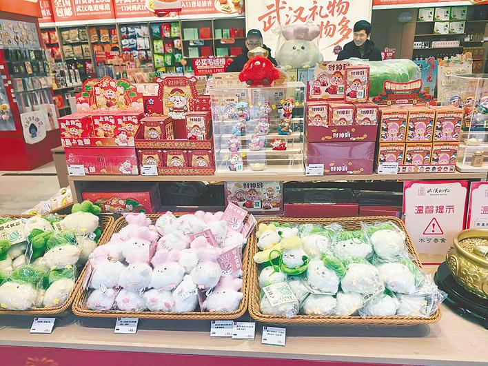 记者看到,除了最显眼的位置外,还有一整面墙和一个专门柜台都留给了武汉方言毛绒玩偶。蒜鸟系列也从最初的基本款延伸到蒜鸟弟弟、迷你蒜鸟、佛系蒜鸟、樱花蒜鸟等产品,每一个发出的语音都不一样。“全员饿人”系列柜台,热干面、面窝、鸡冠饺、藕夹、油条等武汉美食与武汉方言结合,既有趣又极具烟火气。“初步统计,今天一上午我们卖出了20多个蒜鸟,10个人中至少有一半的人会购买蒜鸟。上新的佛系蒜鸟卖得比较好,因为新年来了,寓意好。”该店店长徐晶晶说。